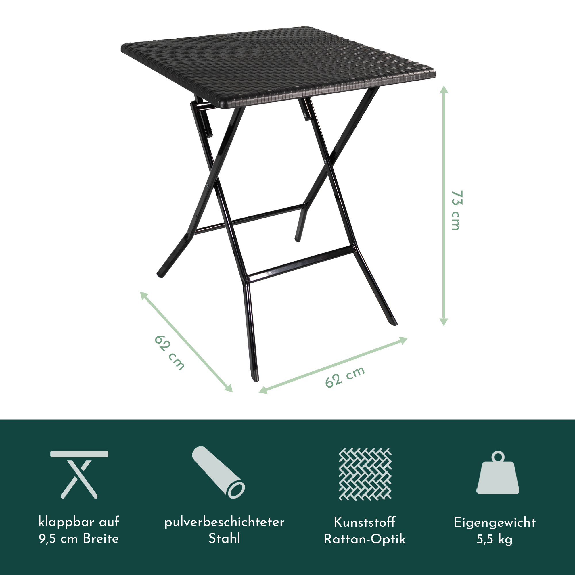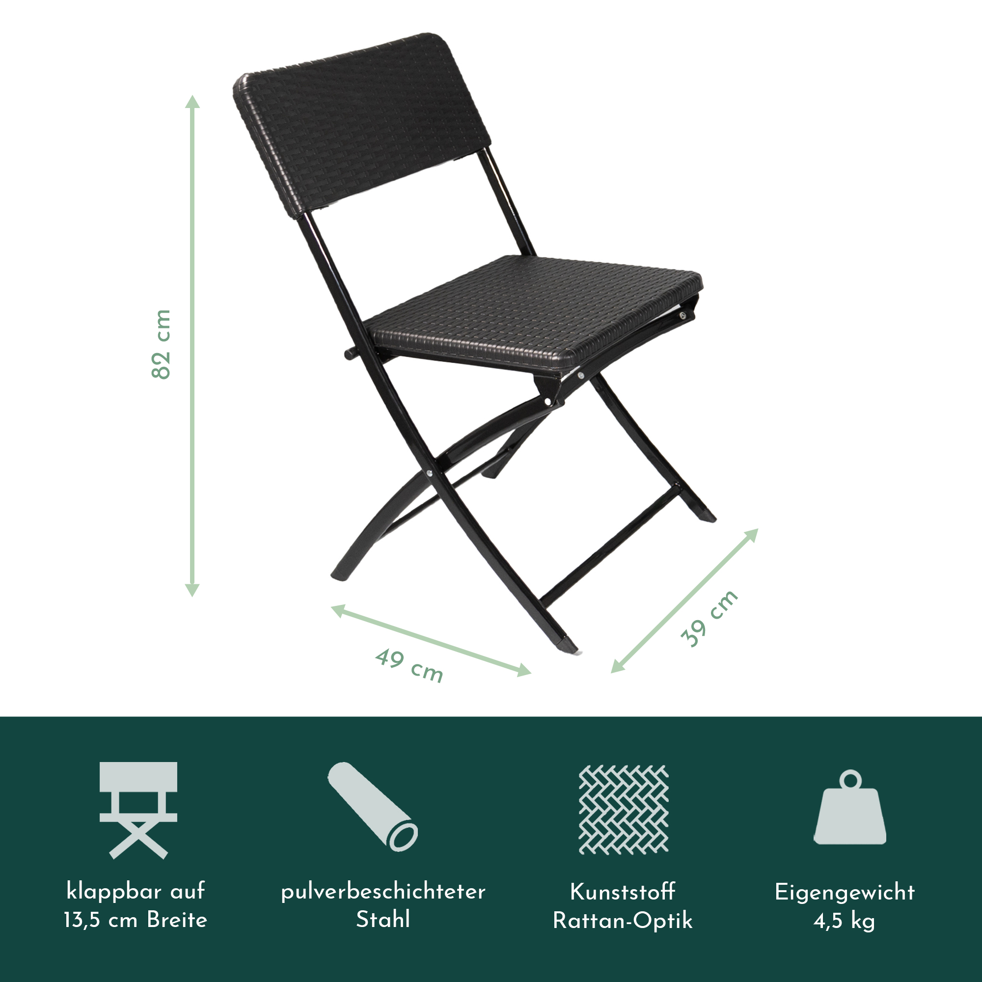 Die Sitzgruppe ist schnell aufgeklappt und lädt zumVerweilen ein. Hergestellt aus wetterfestem Kunststoff mit Rattan-Optik und einem stabilen Stahlrohrgestell in schwarz.