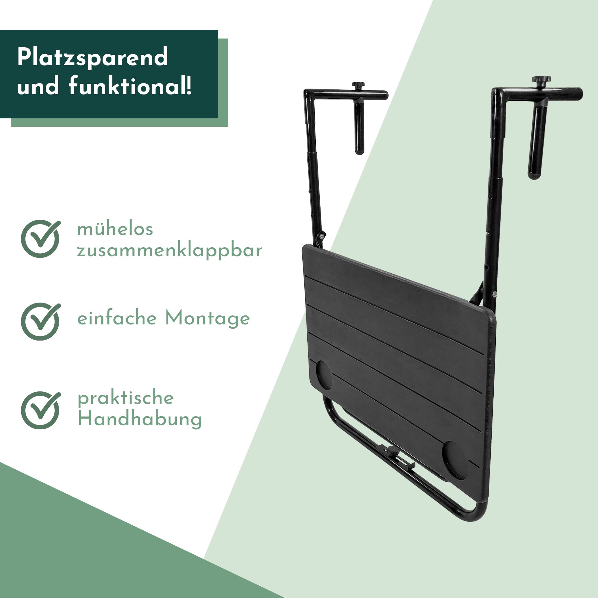 - PLATZSPAREND UND FUNKTIONAL: Wird der Balkonhängetisch nicht gebraucht, kannst Du ihn mit wenigen Handgriffen zusammenklappen und platzsparend aufbewahren. Dadurch ist der Balkontisch ideal für kleine oder schmale Balkone geeignet