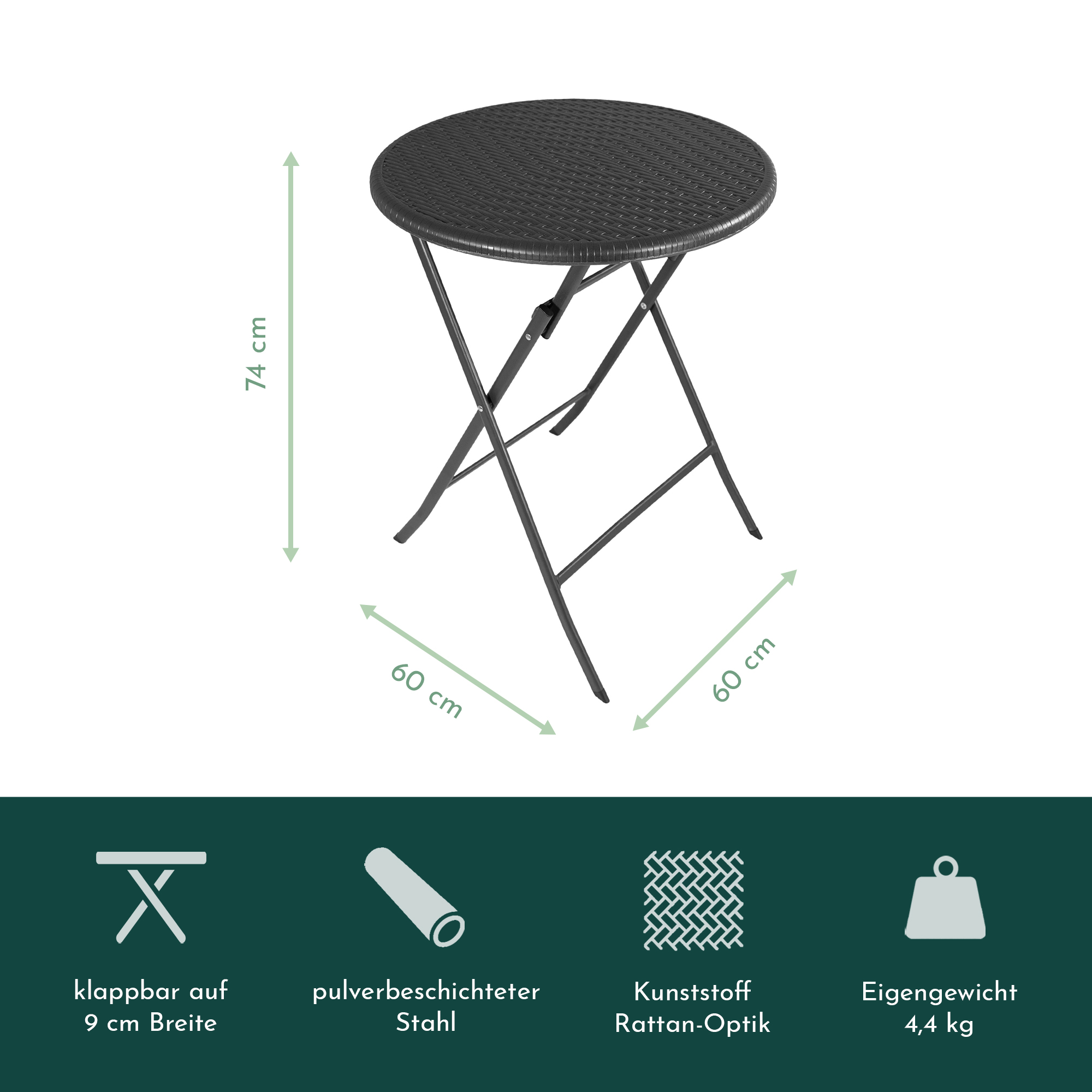 - Material Tischplatte: Kunststoff, Rattan-Optik, schwarz