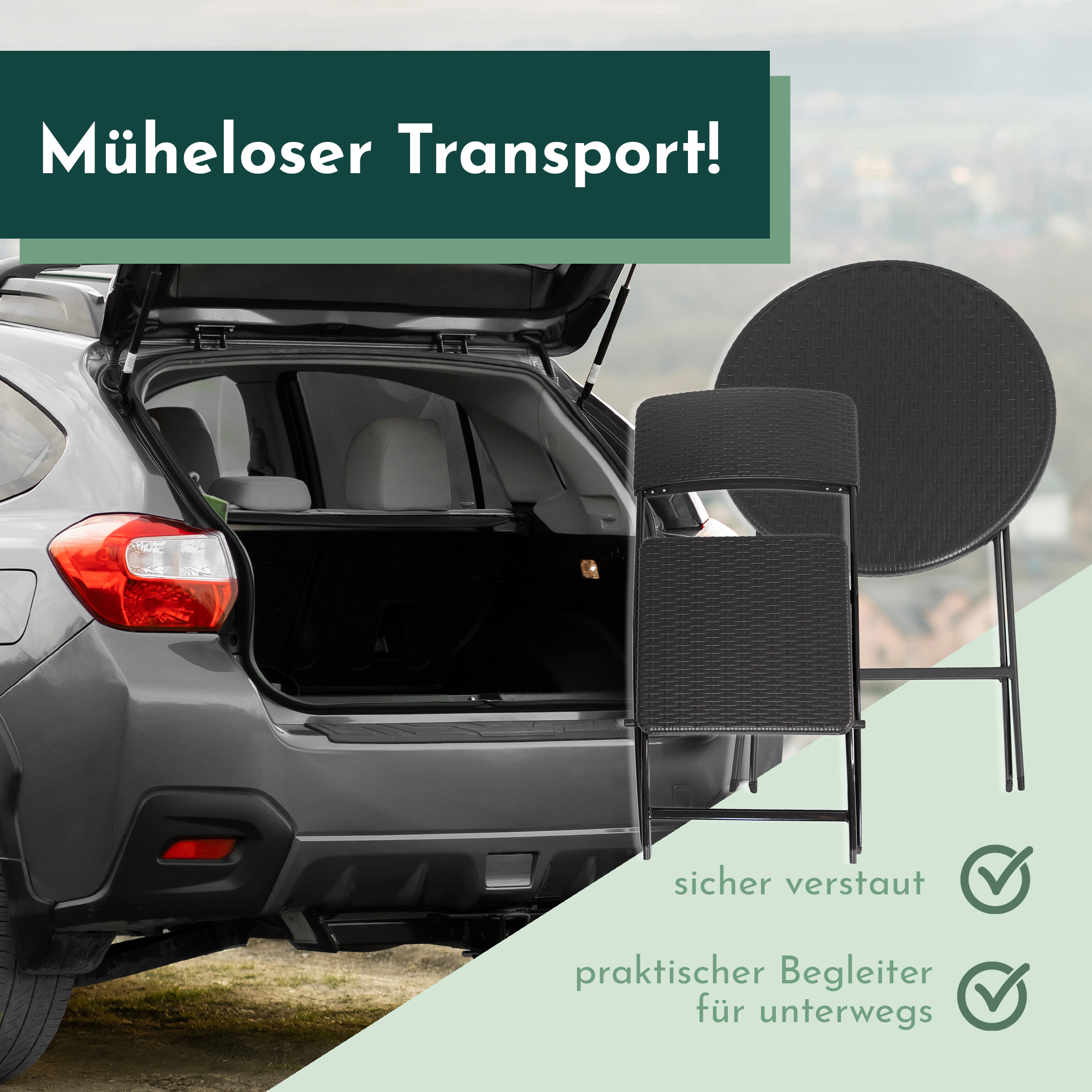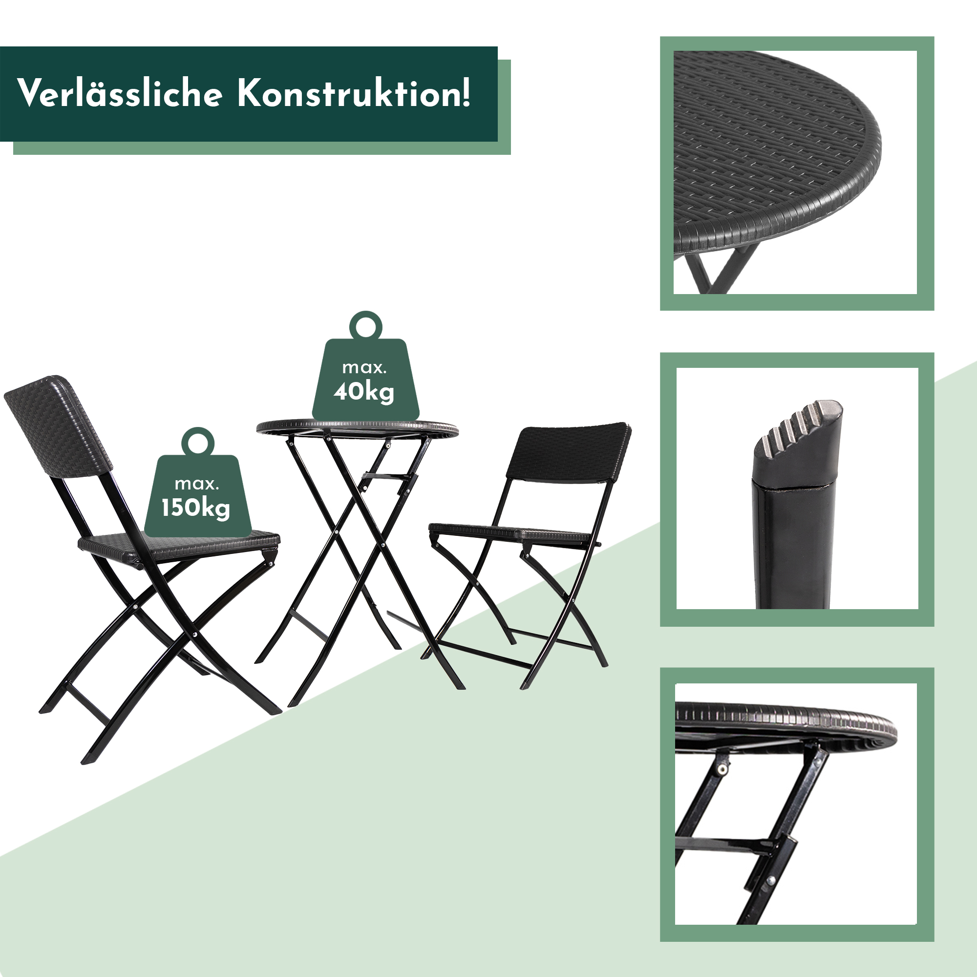- KLAPPBAR UND TRANSPORTABEL: Das Klappdesign des Balkon Sets ermöglicht eine unkomplizierte Verstauung und mühelosen Transport. Gönne Dir maximale Flexibilität, mit unserem Balkonset - einfach transportieren und aufbauen, wo Du die Essgruppe benötigst