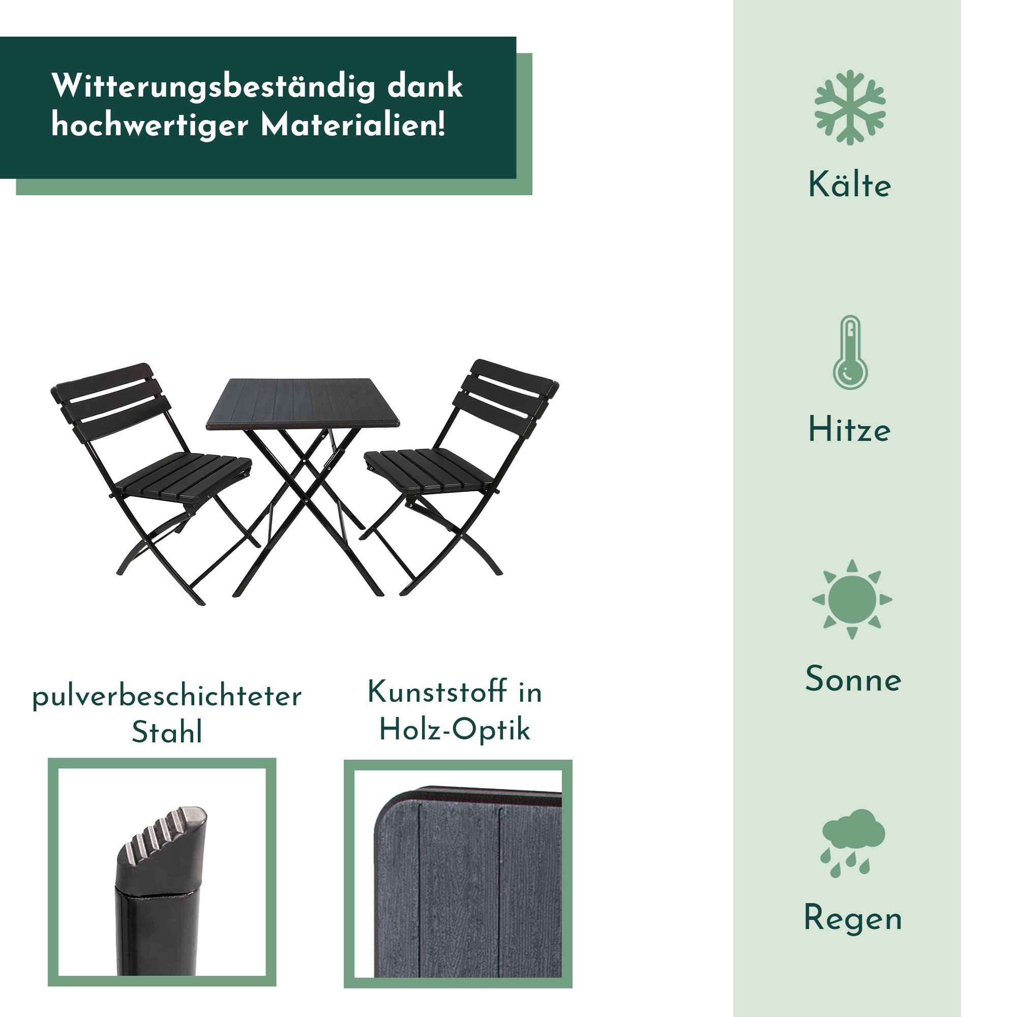 Unser Balkonmöbel Set wurde speziell konzipiert, um den begrenzten Platz auf Balkonen optimal zu nutzen. Die intelligente Platznutzung ermöglicht es, selbst auf kleinen Flächen eine komfortable und einladende Sitzecke zu schaffen. Dieses durchdachte Design wird durch die Klappfunktion des Balkonmöbel-Sets weiter verstärkt, was nicht nur eine unkomplizierte Verstauung, sondern auch einen mühelosen Transport ermöglicht. Mit dieser Flexibilität kannst Du das Balkonset problemlos dorthin bewegen und aufstellen, wo Du die Essgruppe gerade benötigst. Die Vielseitigkeit des Balkon Möbel Sets wird durch seine Anpassungsfähigkeit sowohl im gewerblichen als auch im privaten Bereich unterstrichen. Die Robustheit und Wetterbeständigkeit des Balkon Sets sind weitere entscheidende Merkmale. Hergestellt aus hochwertigem Stahl und robustem Kunststoff, verspricht das Gartenmöbel Set langanhaltende Freude. Diese langlebigen Eigenschaften machen es nicht nur für den privaten Gebrauch, sondern auch für den Einsatz in gastronomischen Betrieben ideal. Abgerundet wird das Angebot durch die pflegeleichten Eigenschaften des Bistrosets. Die Reinigung gestaltet sich äußerst simpel – ein feuchtes Tuch genügt normalerweise, um die Oberflächen mühelos zu säubern.