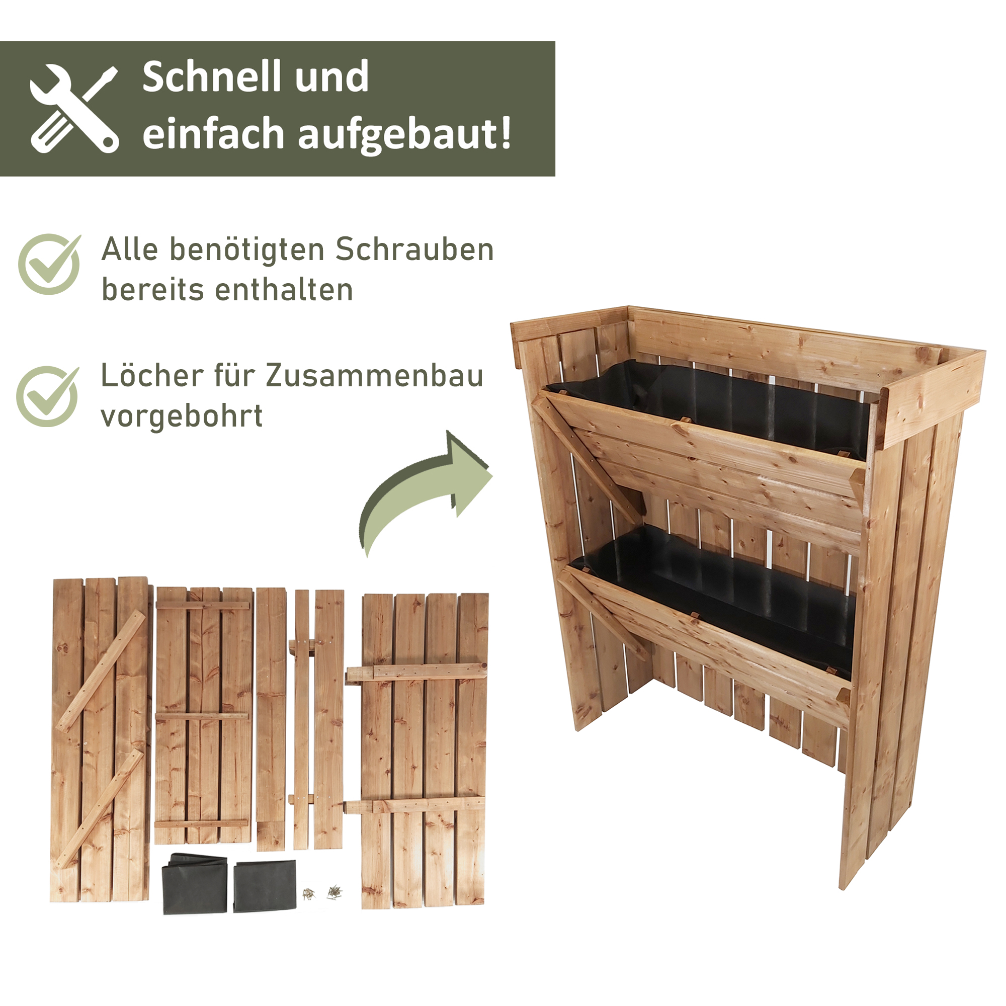 Die Robustheit und Stabilität unseres Produkts wird durch hochwertiges Kiefern- und Fichtenholz gewährleistet, das mit einer Dicke von 1,5 cm eine solide Basis bildet. Durch die Verwendung langer Schrauben für die Verschraubung der Holzelemente wird zusätzliche Stabilität erreicht, was sicherstellt, dass Deine Pflanzen sicher und geschützt platziert sind.