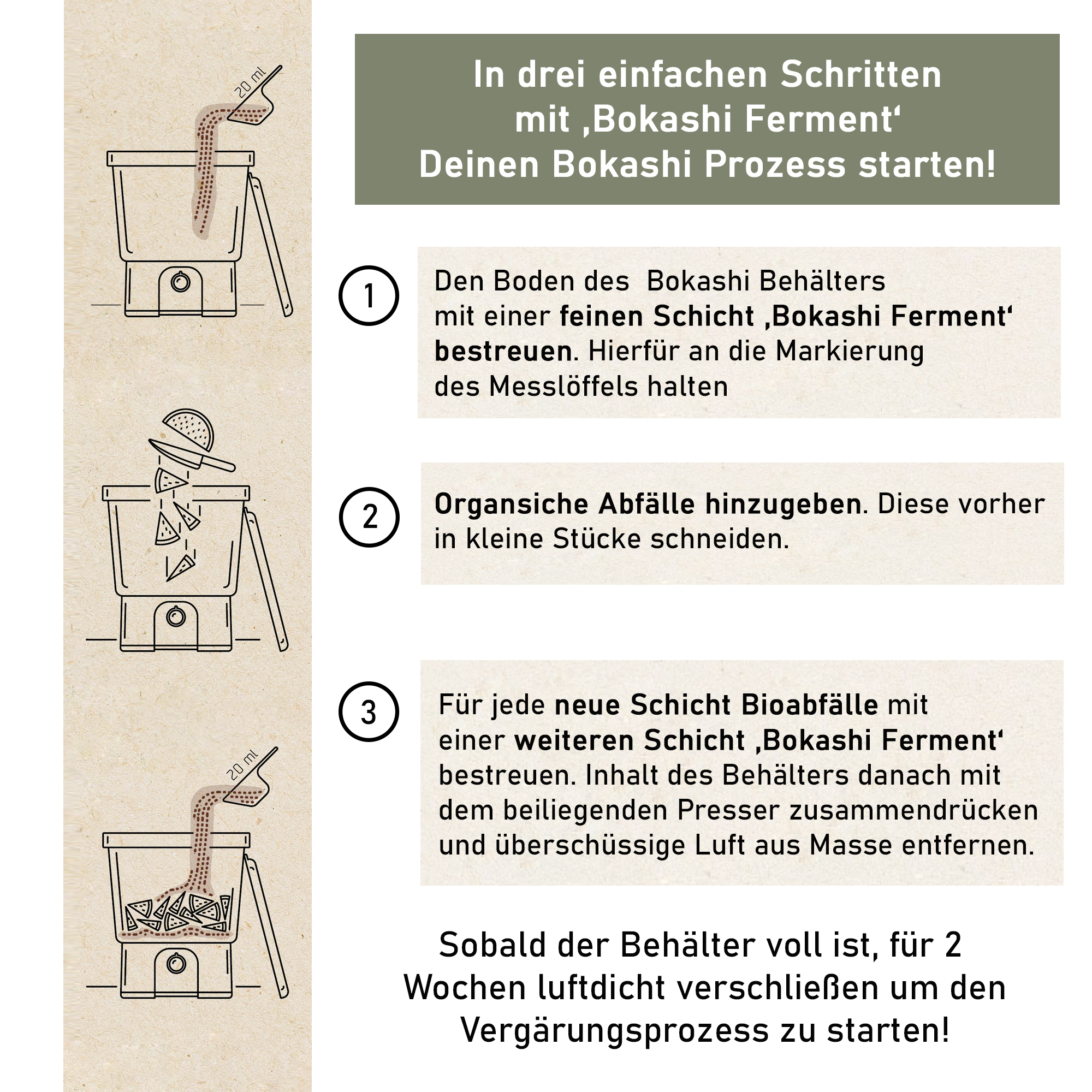 - VERMINDERT DIE GERUCHSBILDUNG: Unser Bokashi Ferment reduziert bei der Fermentation unangenehme Gerüche. Du kannst damit Deinen Bokashi Eimer in der Küche stehen lassen, ohne Sorge vor lästigen Fruchtfliegen