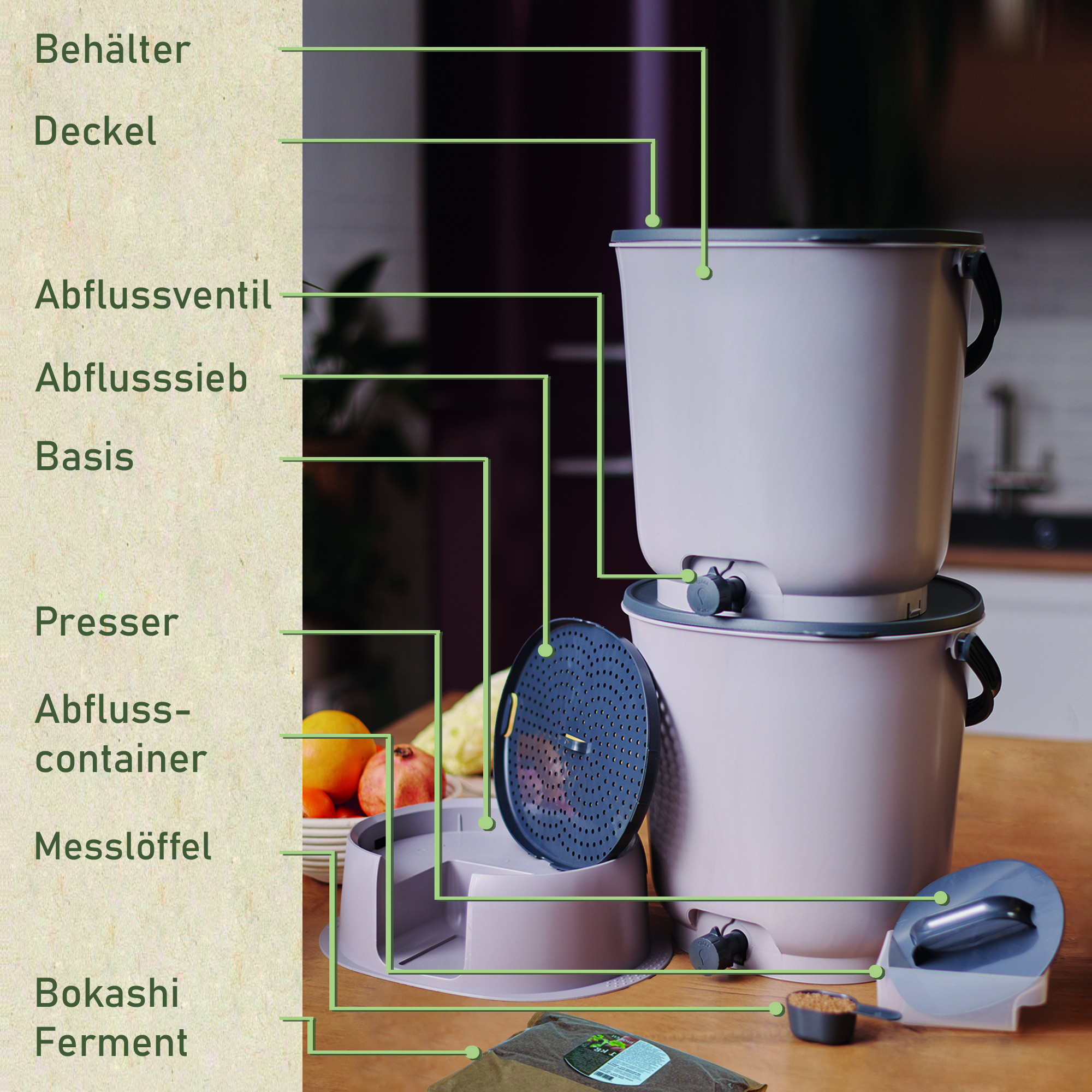 Bokashi Starter Set mit 2 Bokashi Eimer, hellgrau, Bokashi Ferment, Dosierhilfe und Stampfer