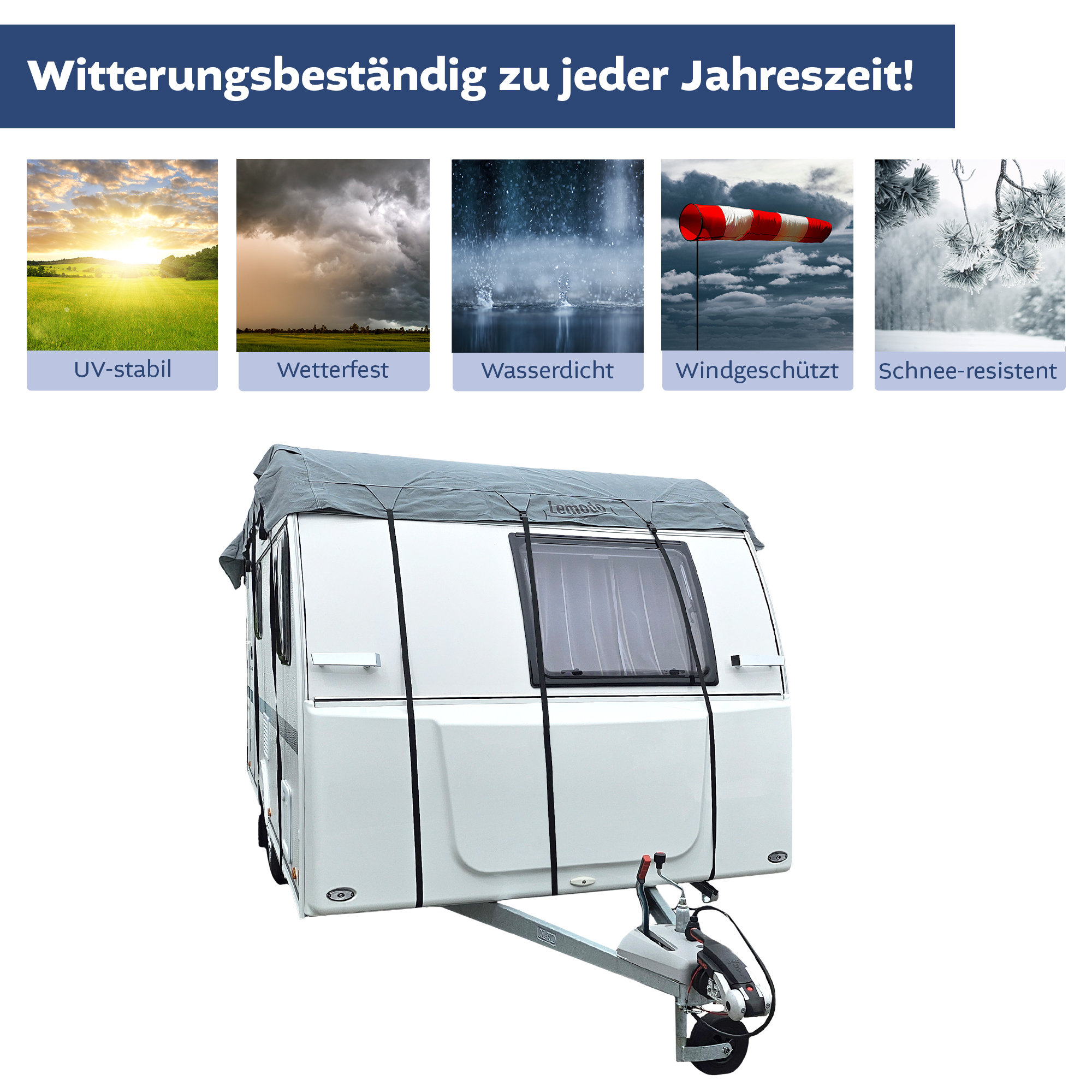 Wählen sie aus drei verschiedenen Längen die perfekt passende Größe für ihren Wohnwagen. Die UV-beständige Schutzhülle ist schnell und unkompliziert angebracht und ebenso leicht wieder zu entfernen.