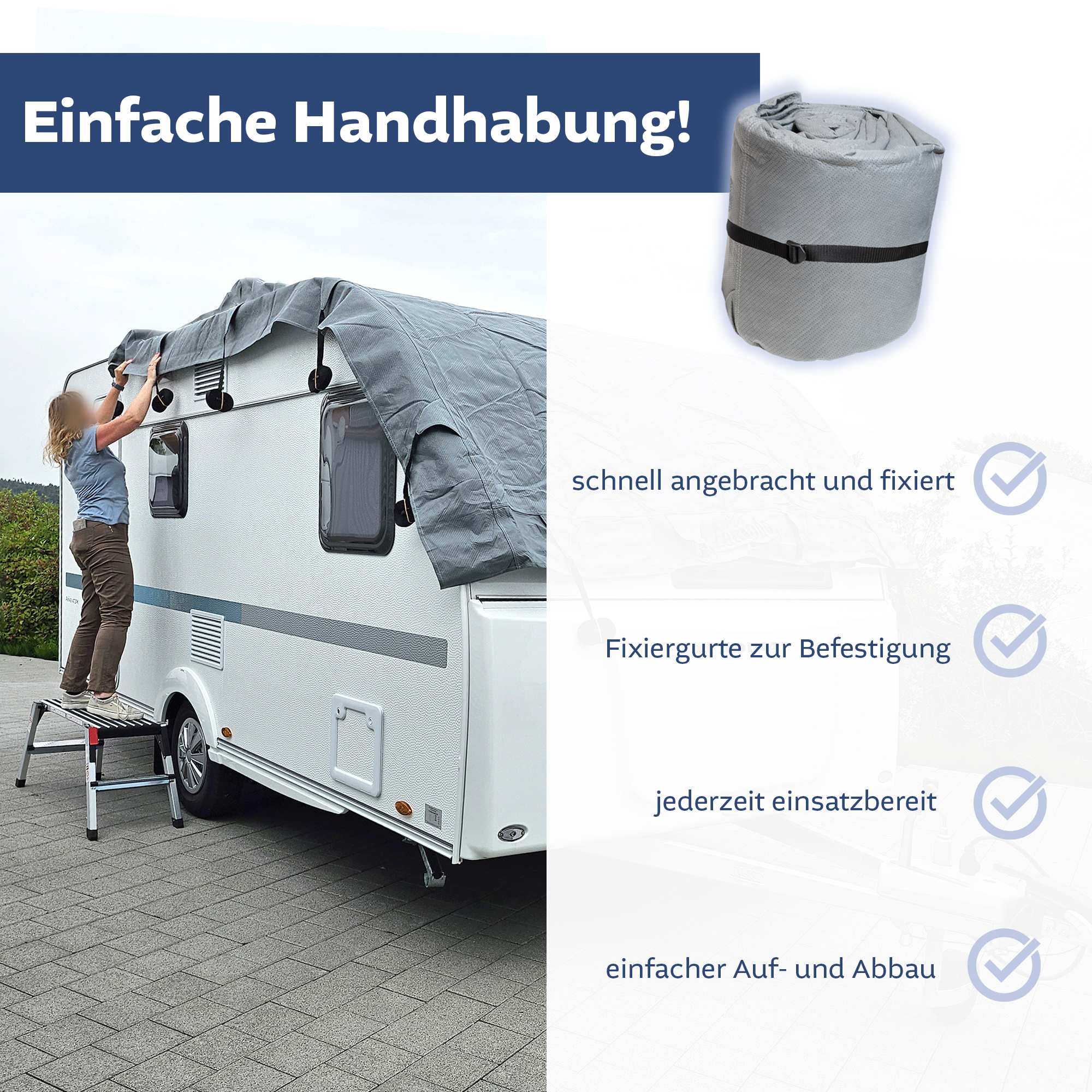 - WITTERUNGSBESTÄNDIG: Die Schutzhülle für ihr Caravan-Dach ist aus robustem, 160 g/qm starkem Gewebe. Die Schutzplane ist reißfest und UV-stabil. Zusätzlich ist die Dachplane wasserabweisend und schimmelresistent