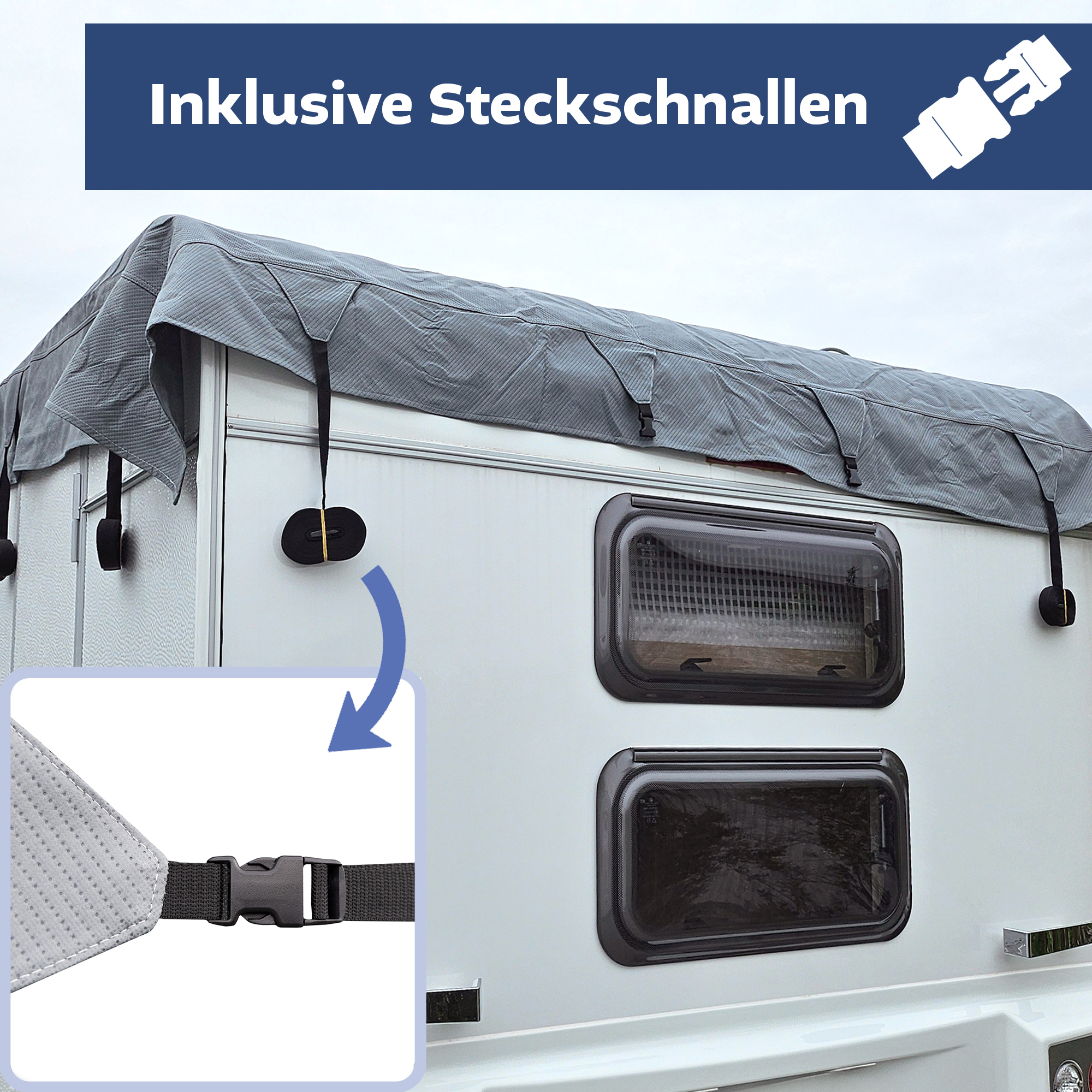 - EINFACHE HANDHABUNG: Eine einfache und schnelle Anbringung der Wohnwagen Abdeckplane gewährleisten die leicht zu bedienenden Spanngurte an den Seiten. Für Front und Heck gibt es jeweils 3 Sicherungsgurte