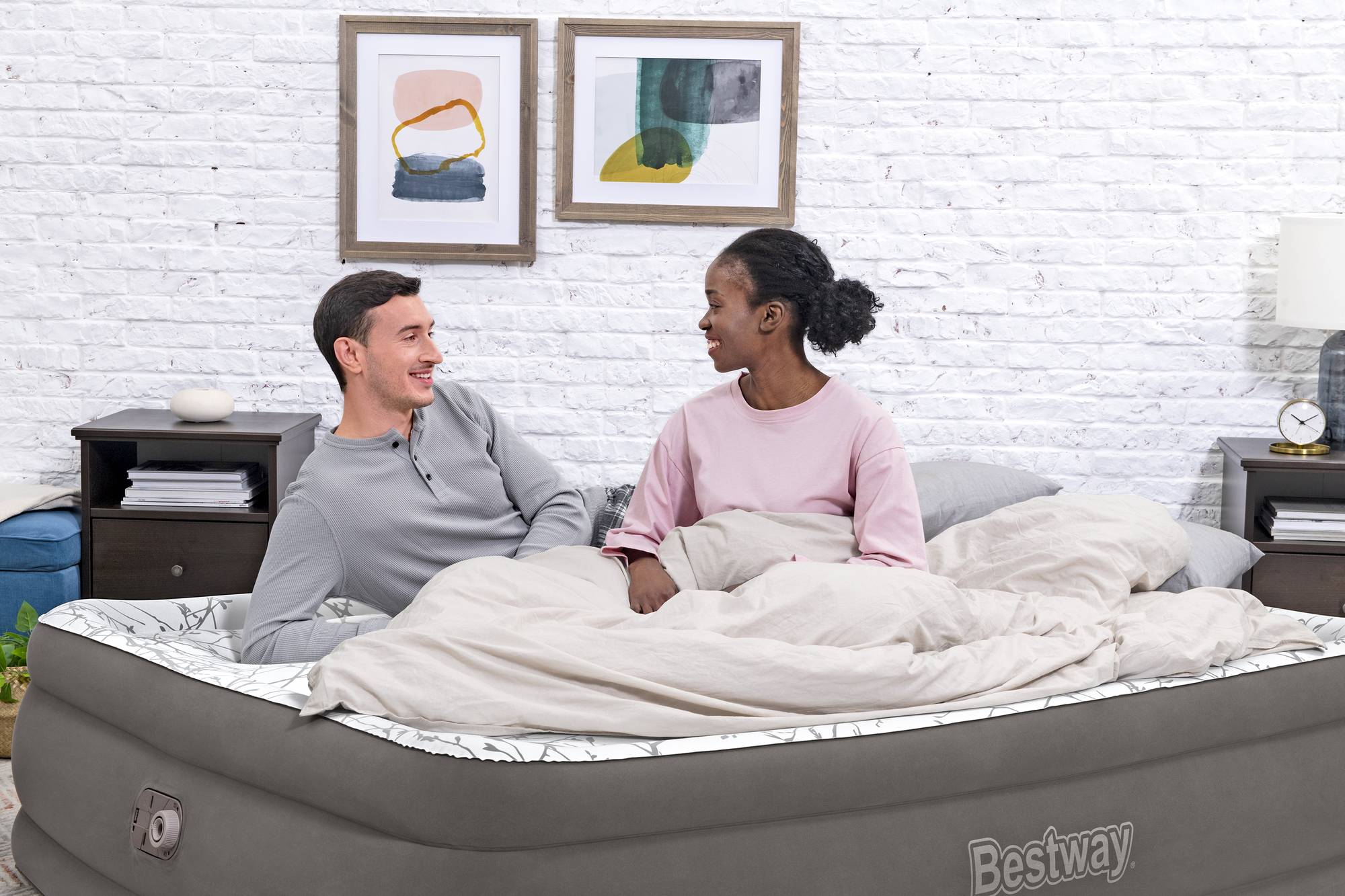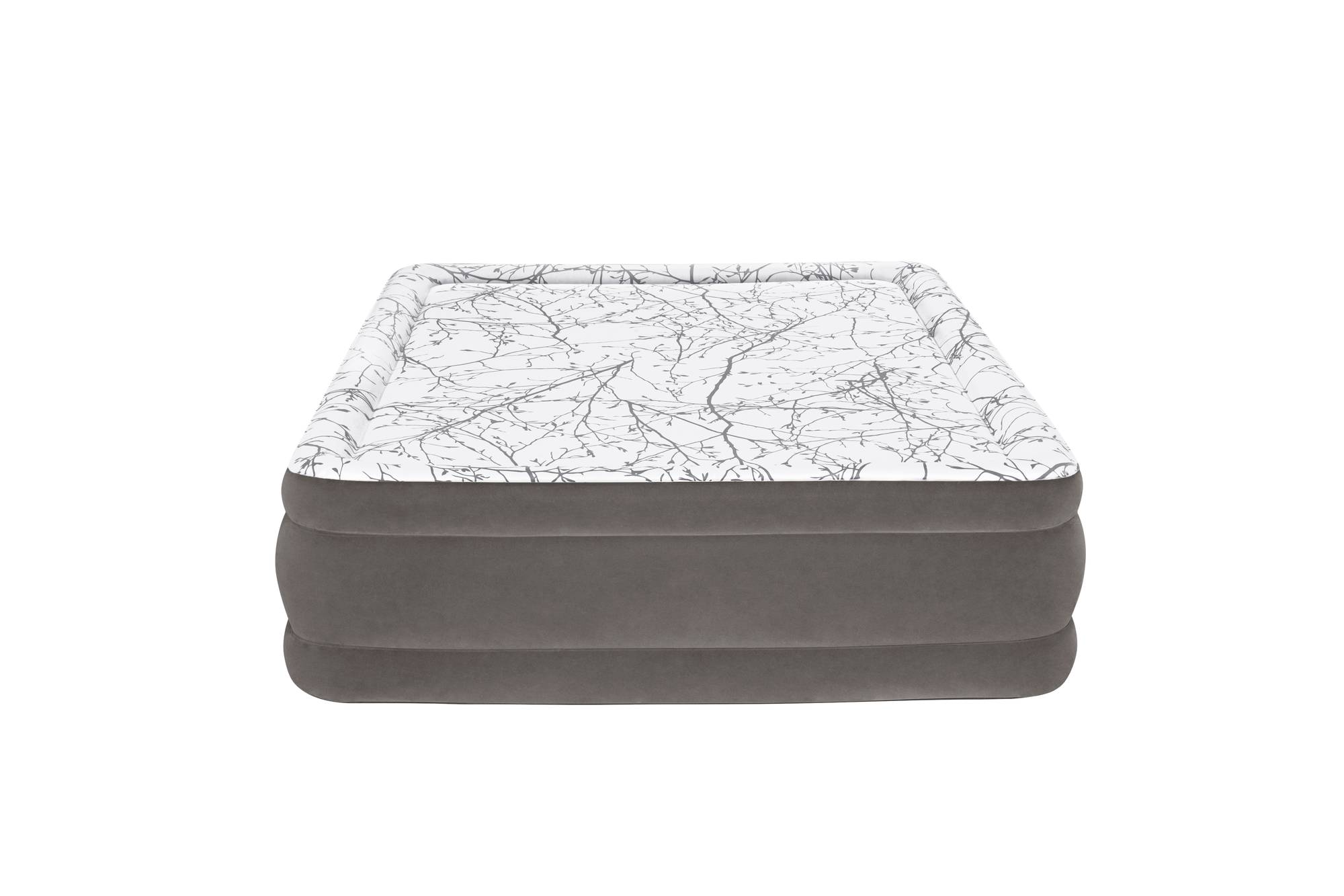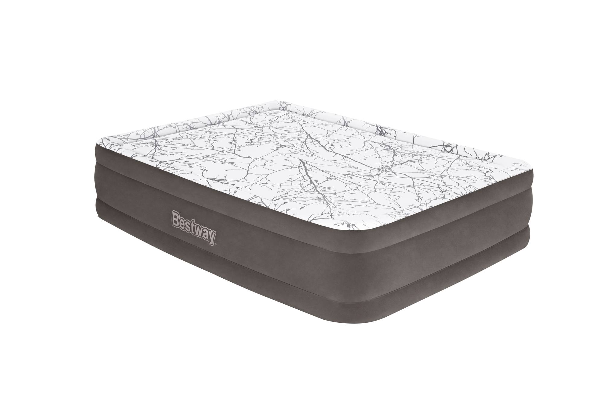 Wachen Sie wunderbar erholt auf dem Bestway TriTech Cushify Top Luftbett auf! Dieses Luftbett verspricht Stärke, Langlebigkeit und Komfort die ganze Nacht lang. Dank ihrer kompakten Größe und der integrierten Elektropumpe ist das Luftbett schnell und direkt einsatzbereit. Dank der antimikrobiellen Ultra-Fresh-Oberfläche schützt Ihr Luftbett vor dem Wachstum von geruchsverursachenden Bakterien, Schimmel und Mehltau auf der Liegefläche geschützt. Langlebige Konstruktion: Die komfortable Liegefläche und die robuste Konstruktion bieten alle Voraussetzungen für einen erholsamen Schlaf. Das Luftbett besteht aus 3-lagigem TriTech-Material, welches Langlebigkeit und Festigkeit bietet und gleichzeitig dafür sorgt, dass das Bett trotz mehrmaligem Auf- und Abpumpen seine Formfestigkeit behält. Außerdem wird der Luftverlust während der Nacht minimiert. Das TriTech-Material erhöht den internen Dehnungswiderstand und bietet eine formschöne Schlaflösung. Dieses langlebige, belastungsgeprüfte Material hält all dem Gewicht und den Bewegungen stand, die mit einem erholsamen Schlaf einhergehen. Luxuriöse Oberfläche: Die Cushify Top-Liegefläche aus Schaumstoff Komfort pur. Das weiche komfortable Material fühlt sich an wie Plüsch und sorgt für eine angenehme Nachtruhe. Elegantes, trendiges Muster: Das Luftbett ist vollständig mit dem trendigen Fashion Flock-Design ausgestattet. Das komfortable Material mit elegantem Aufdruck, verleiht dem Luftbett ein hochwertiges Erscheinungsbild. Es fügt sich nahtlos in jedes Gäste- oder Wohnzimmer sowie überall dort ein, wo ein zusätzlicher Schlafplatz benötigt wird. Einfacher Aufbau: Die integrierte Elektropumpe pumpt das Luftbett in 240-300 Sekunden auf, sodass es direkt einsatzbereit ist. Am nächsten Morgen kann mithilfe dieser das Luftbett mühelos wieder entleert werden. Legen Sie das zusammengeklappte Bett einfach in die mitgelieferte Aufbewahrungstasche, um es bequem zu transportieren und zu lagern.