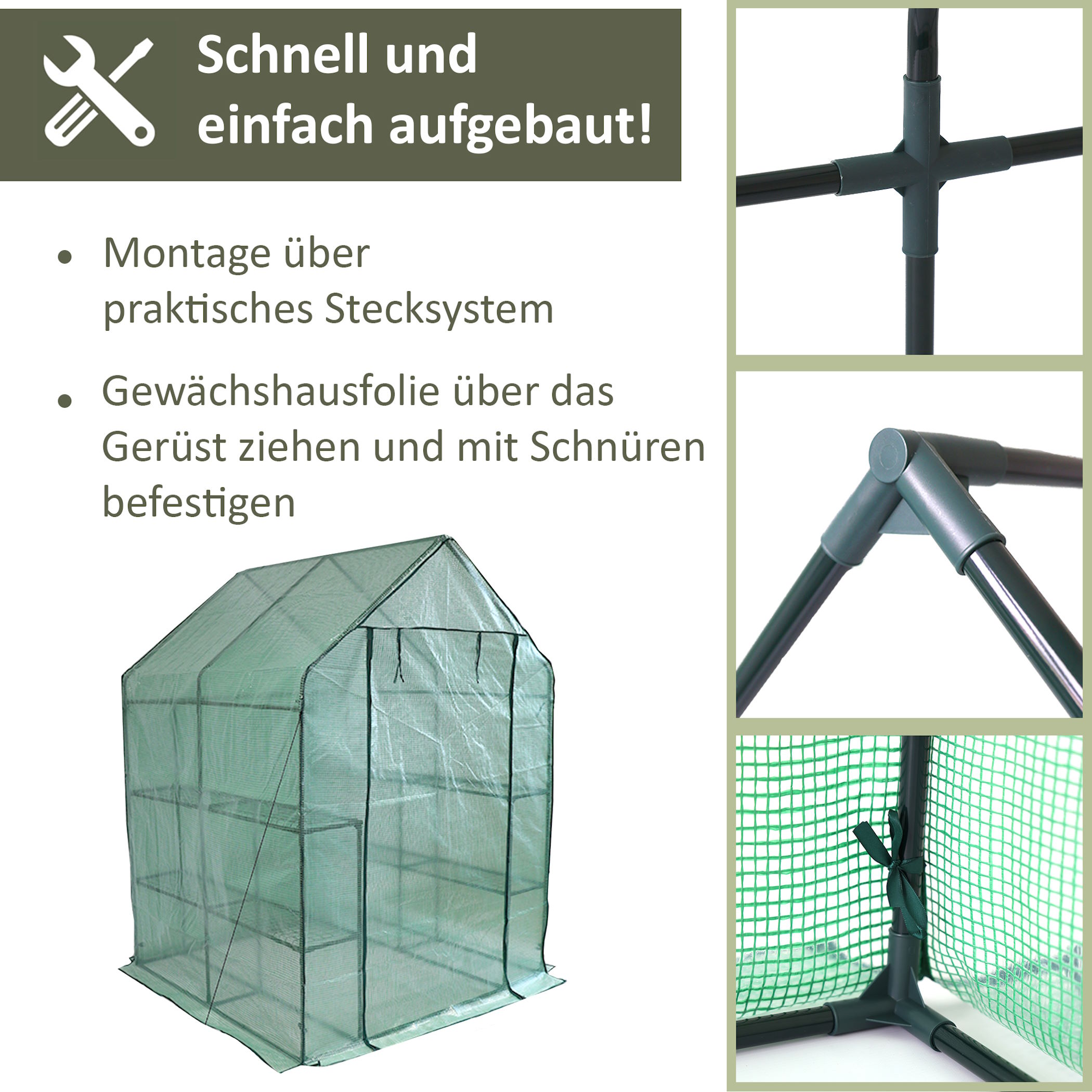 Ein Foliengewächshaus ist eine großartige Möglichkeit, um das Wachstum und die Gesundheit Deiner Pflanzen zu beschleunigen. Es schafft ein kontrolliertes Mikroklima, in dem Deine Pflanzen optimal gedeihen können. Egal ob Zier- oder Nutzpflanzen, ein Gewächshaus schützt sie vor ungünstigen Witterungsbedingungen und Schädlingen und sorgt für eine längere Ernteperiode. Ein weiterer Vorteil ist die einfache Handhabung. Foliengewächshäuser sind einfach aufzubauen und erfordern kein spezielles Werkzeug oder Fachwissen. Auch die Instandhaltung ist unkompliziert und erfordert kein hohes Maß an Wartungsaufwand. Das Gewächshaus mit robuster Gewächshausfolie schützt Deine Pflanzen vor Schädlingen aus dem Garten und sorgt für stabile und wärmere Temperaturen, was das Wachstum der Pflanzen fördert.Moderne Foliengewächshäuser sind aus hochwertigen Materialien gefertigt und bieten robuste Konstruktionen, die eine lange Lebensdauer gewährleisten. Trotz ihrer kostengünstigen und einfachen Alternative zu traditionellen Gewächshäusern ist ein Foliengewächshaus keineswegs minderwertig. Im Gegenteil, sie sind eine großartige Option für jeden, der ein kontrolliertes Mikroklima für seine Pflanzen schaffen möchte. SCHUTZ VOR UMWELTEINFLÜSSEN: Das Foliengewächshaus bietet einen effektiven Schutz vor Umwelteinflüssen. Das robuste Gewächshaus schützt Deine Zier- und Nutzpflanzen vor unvorhersehbarem Wetter, wie zum Beispiel Hagel oder Starkregen BESSERE ERNTE: In dem geschützten Umfeld des Treibhauses finden Deine Pflanzen ideale Anbaubedingungen vor, die zu einer besseren Ernte führen. Ein weiterer Vorteil des Folienzeltes ist, dass Du Deine Anbausaison verlängern kannst EINFACHER ZUSAMMENBAU: Das Tomaten Gewächshaus ist dank Stecksystem einfach zu montieren. Dies ermöglicht eine schnelle und unkomplizierte Montage und Demontage des Tomatenhauses, so dass Du es bei Bedarf auch schnell abbauen kannst ROBUST UND HALTBAR: Unser Treibhaus ist robust und langlebig, da wir ausschließlich hochwertige Materialien verwenden - pulverbeschichtete Stahlrohre und eine robuste Gewächshausfolie bilden die Basis für unser Foliengewächshaus KOSTENGÜNSTIG: Unser Folien Gewächshaus bietet eine kostengünstige und dennoch qualitativ hochwertige Möglichkeit, Deine Zier- und Nutzpflanzen vor Witterungsbedingungen und Schädlingen zu schützen Produktdetails und Lieferumfang: Abmessungen: 180 x 90 x 90 cm (L x B x H) Produktmaterial: 135g/qm PE-Abdeckung, 0,3 mm dickes Stahlrohr, pulverbeschichtet 2 Reißverschluss-Fenster SCHUTZ VOR WETTEREINFLÜSSENDas Foliengewächshaus ist ein ausgezeichneter Schutzschild gegen widrige Wetterbedingungen, der Deine Zier- und Nutzpflanzen vor unerwarteten Umwelteinflüssen bewahrt. Sein robustes Material gewährleistet einen zuverlässigen Schutz gegen Starkregen oder Hagel, so dass Deine Pflanzen unversehrt bleiben.Durch den effektiven Schutz des Foliengewächshauses können Deine Pflanzen ungestört wachsen und gedeihen, ohne durch extreme Witterungsbedingungen beeinträchtigt zu werden. Das gibt Dir die besten Voraussetzungen für eine erfolgreiche Ernte und eine schöne Gartensaison. BESSERE ERNTEWenn Du Deine Zier- und Nutzpflanzen in einem geschützten Treibhaus anbaust, kannst Du sicher sein, dass sie optimale Wachstumsbedingungen haben. Das bedeutet, dass sie ausreichend Nährstoffe, Sonnenlicht und Feuchtigkeit erhalten, um gesund zu bleiben und schneller zu wachsen. Das Gewächshaus schützt die Pflanzen auch vor Schädlingen und Krankheiten, die im Freien auftreten können, was zu einer höheren Ernte führen kann.Darüber hinaus verlängert das Treibhaus Deine Anbausaison, indem es ein klimatisch stabiles Umfeld schafft. Im Foliengewächshaus herrschen im Allgemeinen stabilere Temperaturen als im Freien, was das Wachstum Deiner Pflanzen fördert. Durch den Schutz vor Kälte und Wind können Deine Pflanzen auch früher im Jahr gepflanzt werden. Dadurch haben sie eine längere Wachstumsperiode, was zu einem höheren Ernte-Ertrag führen kann.Das Foliengewächshaus bietet die Möglichkeit, eine kontrollierte Umgebung zu schaffen, in der Faktoren wie Luftfeuchtigkeit und Temperatur angepasst werden können, um das Wachstum der Pflanzen weiter zu optimieren. Du kannst die Bedingungen im Gewächshaus an die spezifischen Bedürfnisse Deiner Pflanzen anpassen und somit eine höhere Ernte erzielen.Zusammenfassend bietet ein Anzuchthaus viele Vorteile für den Anbau von Pflanzen aller Art. Es bietet eine geschützte Umgebung, um gesunde und schneller wachsende Pflanzen zu erzeugen, verlängert die Anbausaison und ermöglicht eine kontrollierte Umgebung, um das Wachstum der Pflanzen zu optimieren. Wenn Du Deine Ernte verbessern möchtest, ist ein Foliengewächshaus eine gute Investition EINFACHER ZUSAMMENBAUDas Foliengewächshaus ist einfach zu montieren und erfordert kein spezielles Werkzeug oder Fachwissen. Im Gegensatz zu herkömmlichen Gewächshäusern, bei denen oft mühsame und komplizierte Montageprozesse erforderlich sind, kannst Du unser Treibhaus ohne großen Aufwand zusammenbauen. Auch der Abbau des Foliengewächshauses ist schnell und unkompliziert, so dass Du es problemlos entfernen und an einem anderen Ort wieder aufstellen kannst.Das Tomatengewächshaus wird mit einer detaillierten Anleitung geliefert. Unsere Modelle verfügen über ein Stecksystem, bei dem die Rahmen- und Abdeckungselemente einfach ineinandergesteckt werden können, um das Gewächshaus zusammenzusetzen.Ein weiterer Vorteil des einfachen Zusammenbaus ist, dass Du das Foliengewächshaus bei Bedarf schnell abbauen und verstauen kannst. Dies ist besonders nützlich, wenn Du das Anzuchthaus nur saisonal verwenden möchtest. ROBUST UND HALTBARWir legen großen Wert auf hochwertige Materialien und setzen bei der Konstruktion ausschließlich auf pulverbeschichtete Stahlrohre und eine robuste Gewächshausfolie.Die pulverbeschichteten Stahlrohre sind äußerst widerstandsfähig g