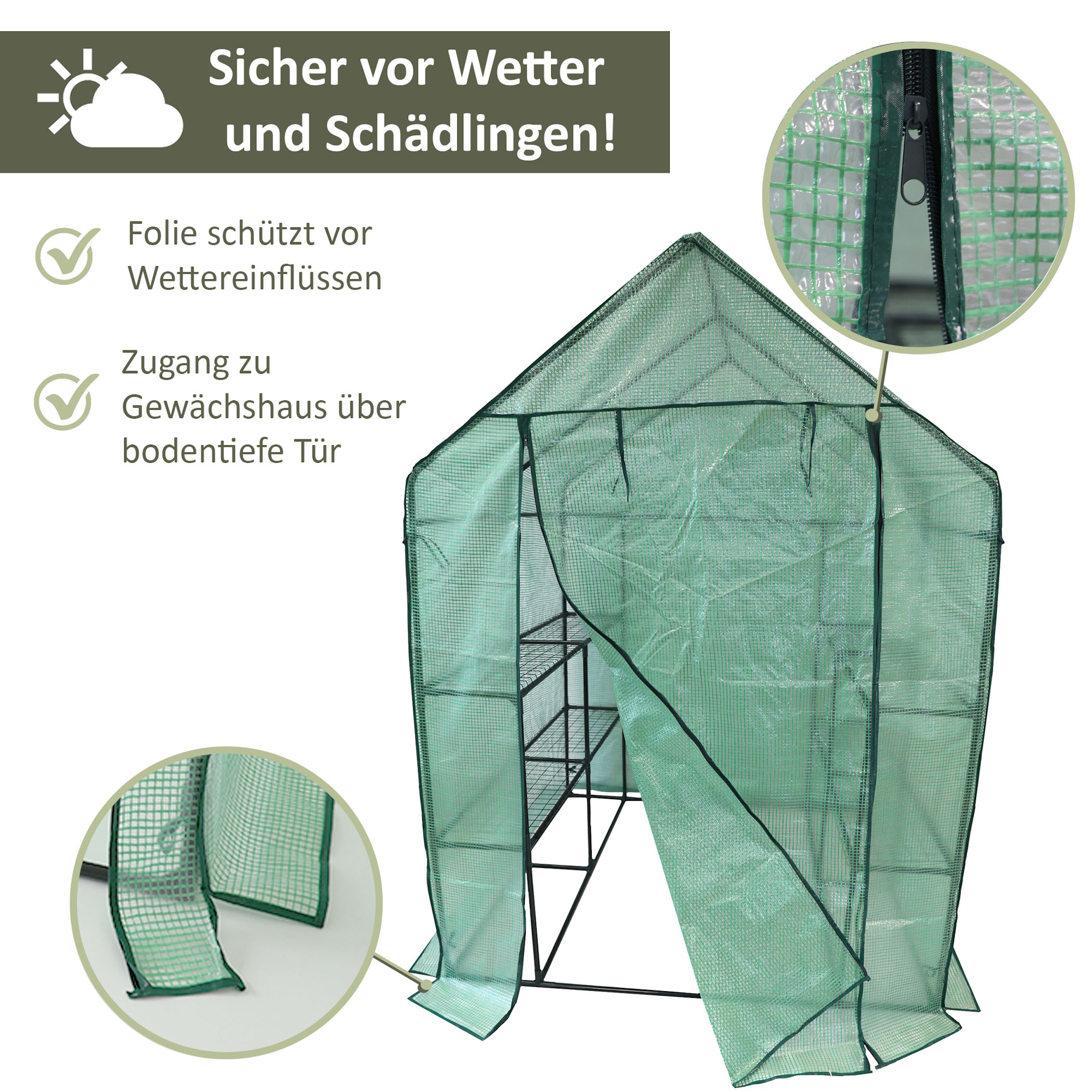 Dieses Foliengewächshaus bietet zudem einen effektiven Schutz für Deine Zier- und Nutzpflanzen vor Schädlingen aus Deinem Garten. Dank der verlängerten Folie an der Bodenseite des Tomatenhauses wird der Schutz noch weiter erhöht. Vögel und Nagetiere können eine Vielzahl von Schäden an Deinen Pflanzen verursachen, indem sie Samen und Früchte fressen oder die Wurzeln, Stängel und Blätter beschädigen. Unser Treibhaus aus robuster Gewächshausfolie ist eine wirksame Möglichkeit, um Deine Pflanzen vor Wetter und Schädlingen zu schützen.