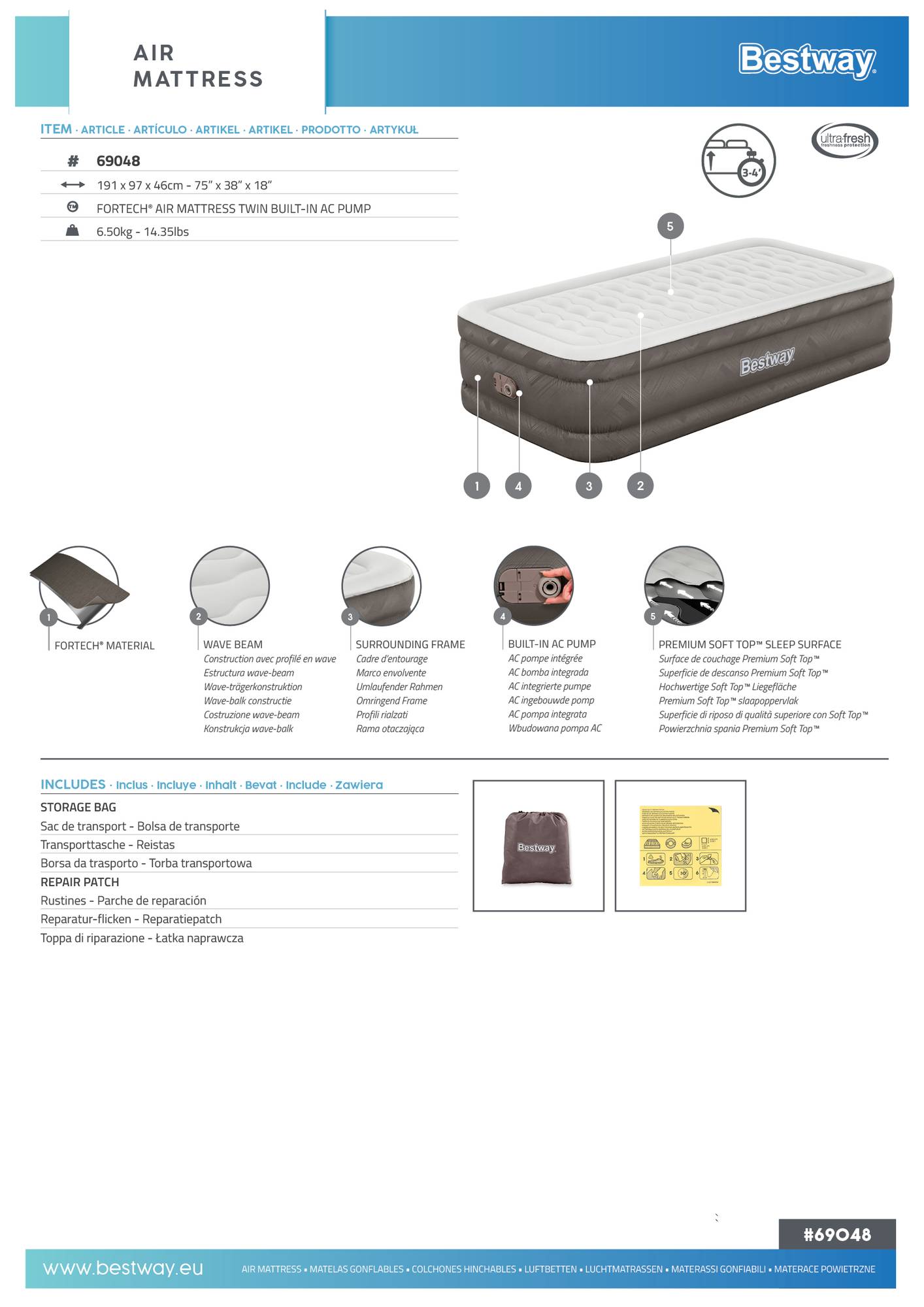 Die Bestway® Fortech™ Luftbett single ist sowohl langlebig als auch komfortabel und besitzt eine dehnbare, komfortable Oberfläche! Dieses Luftbett ist robust und dennoch leicht. Und mit der antimikrobiellen Ultra-Fresh® -Oberfläche wird Ihr Bett vor dem Wachstum von geruchsverursachenden Bakterien, Schimmel und Mehltau optimal geschützt. Langlebige Konstruktion: Diese Luftmatratze ist auf Langlebigkeit ausgelegt und besteht aus unserem robusten Fortech™ -Material. Diese Kombination aus Vinyl und Polyester ist stärker als traditionelles Vinyl, aber dennoch um bis zu 10 % leichter. Es ist außerdem 75 % reißfester, 92 % dehnungsbeständiger und 150-mal abriebfester. Dank des speziell gewebten Materials, wird das Bett weder zu heiß noch zu kalt. Schlafen Sie bequem auf der hochwertigen Konstruktion aus inneren Trägern, welche die Ausrichtung der Wirbelsäule unterstützt und eine formschöne Druckentlastung während des Schlafs bieten. Das umlaufende Rahmendesign verhindert zudem ein Herunterrollen während der Nacht. Luxuriöse Oberfläche: Die Premium Soft Top™ Liegefläche besteht aus 2 Schichten samtartigen Materials. Diese schließen die Luft zwischen sich ein und bilden so ein komfortables Polster für einen erholsamen Schlaf. Einfacher Aufbau: Die integrierte Elektropumpe pumpt das Luftbett in 240 Sekunden, sodass es direkt einsatzbereit ist. Am nächsten Morgen kann das Bett mithilfe der Pumpe mühelos wieder entleert werden. Legen Sie das zusammengefaltete Bett einfach in die mitgelieferte Tasche, um es leicht transportieren und lagern zu können.