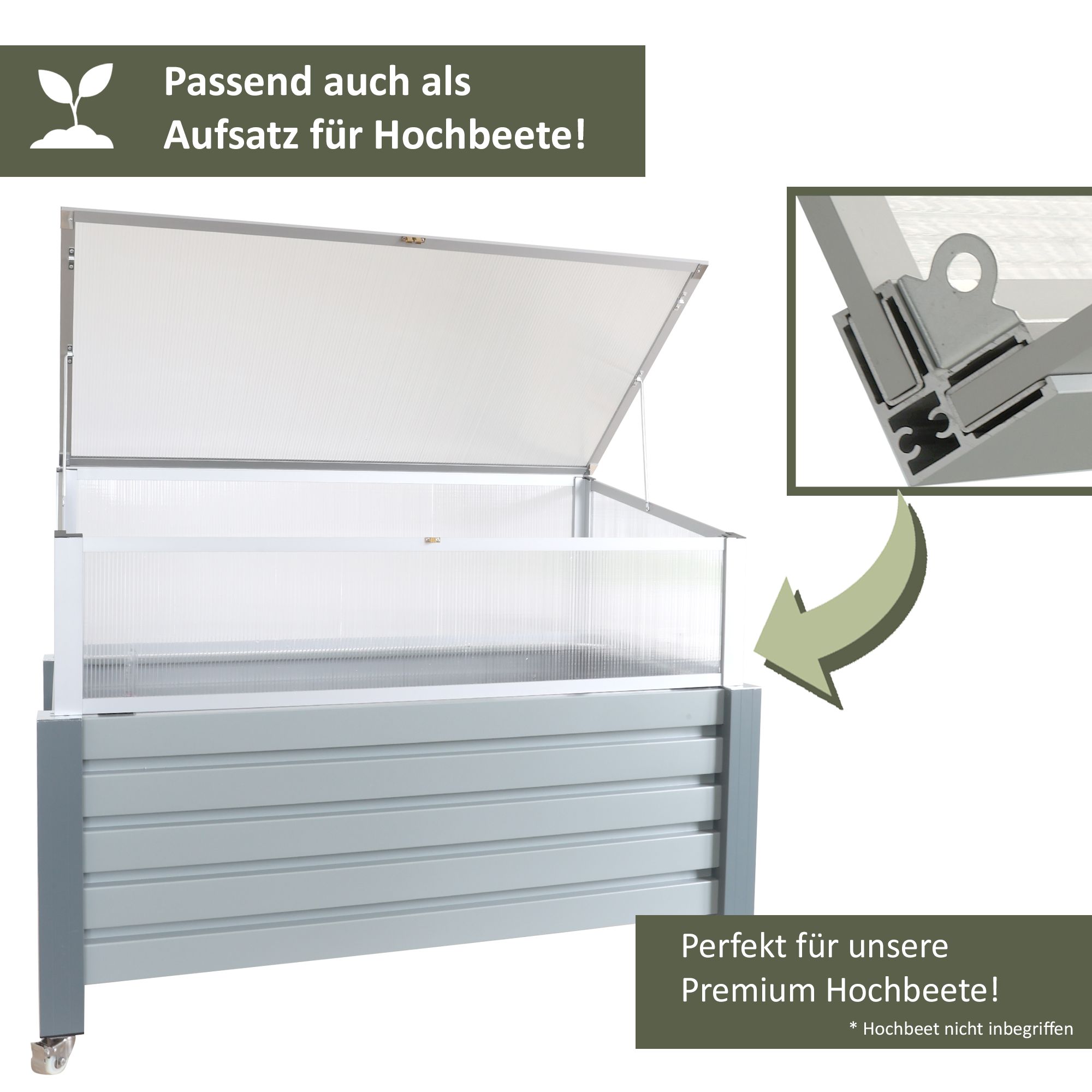 Dieser Frühbeetaufsatz passt ideal auf die exklusiv bei uns erhältlichen NATIV Hochbeete “Triest” und “Siena”.