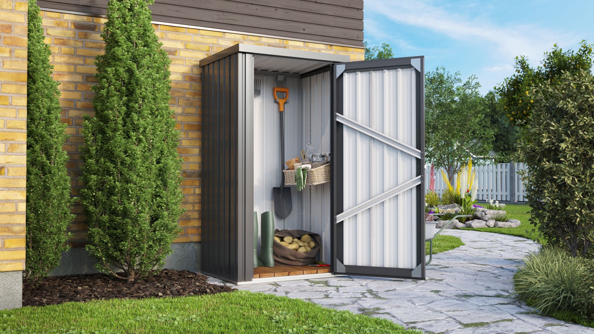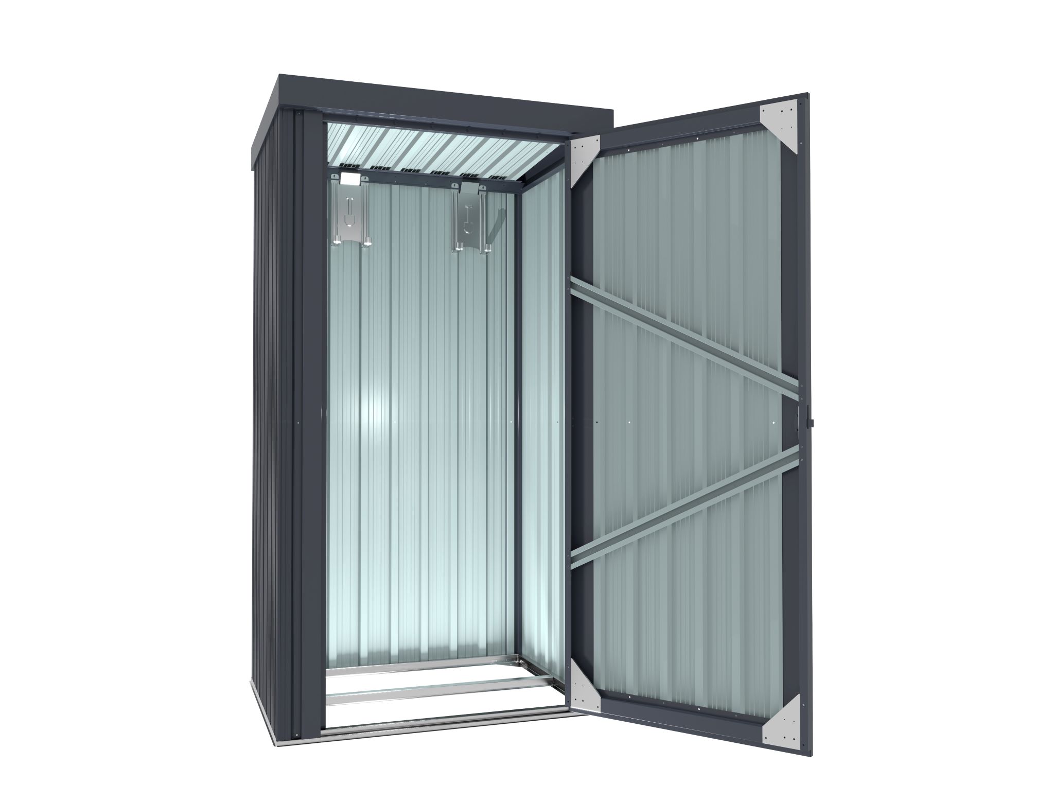 Mit einer kompakten Grundfläche von nur 0,75 m² findet dieser kleine Geräteschrank selbst auf einer Terrasse oder im Vorgarten problemlos Platz. Im Lieferumfang enthalten sind ein Zylinderschloss, ein Bodenrahmen, zwei Werkzeughaken sowie ein vierteiliges Verankerungskit zur sicheren Befestigung am Untergrund. Die integrierte Schwingtür ermöglicht eine platzsparende Nutzung des Innenraums. Die moderne Farbgebung in anthrazit fügt sich harmonisch in nahezu jedes Umfeld ein. Der Metallgeräteschrank wird als Bausatz und ohne Boden geliefert.
