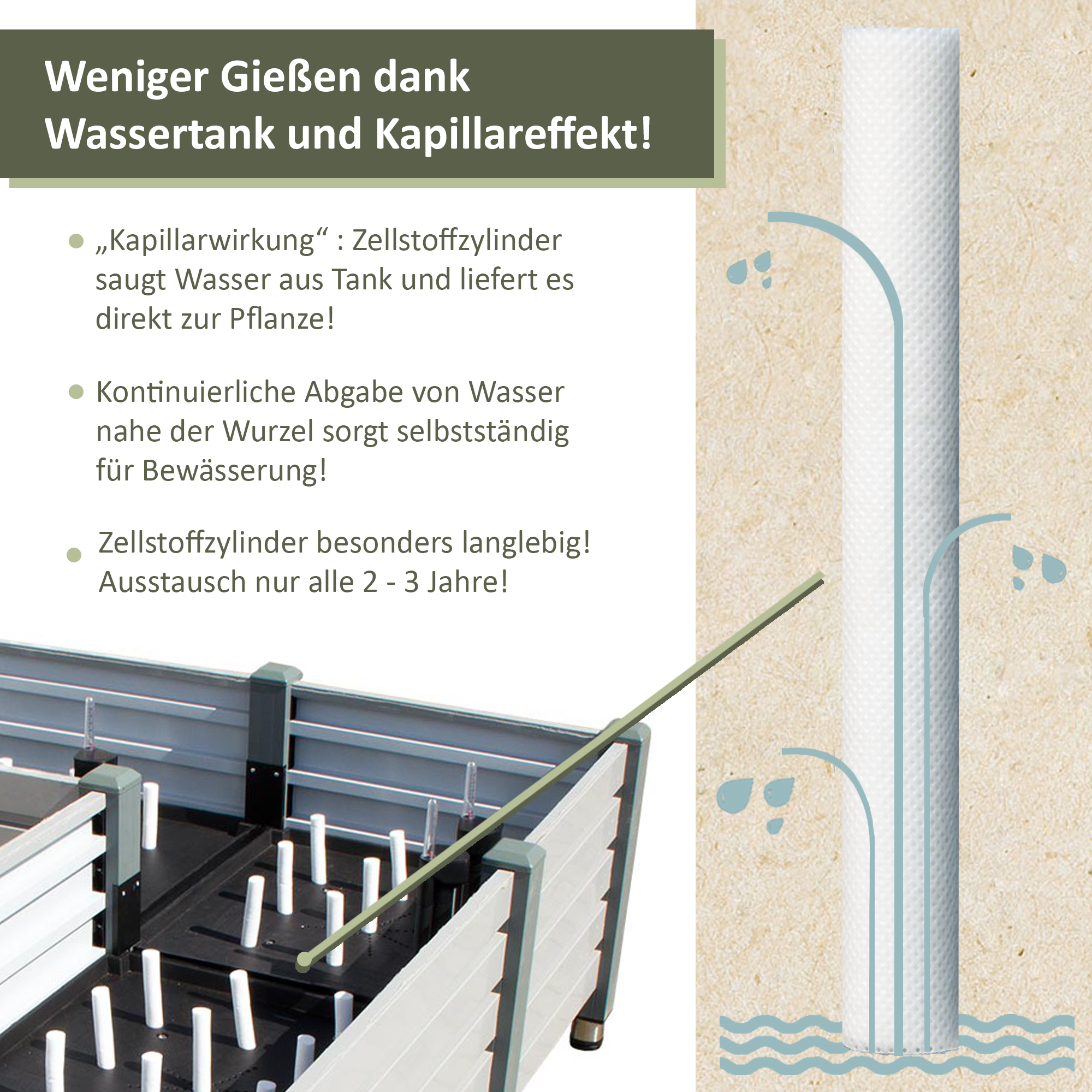Unser Hochbeet verfügt über ein intelligentes, patentiertes Bewässerungssystem, das eine optimale Versorgung der Pflanzen sicherstellt und auf der Kapillarwirkung basiert. Dabei werden Zellstoffzylinder eingesetzt, die kontinuierlich Wasser an die Wurzeln abgeben. Im Vergleich zum herkömmlichen Gießen von oben ist dieses System besonders effizient, da es die Verdunstung reduziert. Außerdem wird Staunässe vermieden, was wiederum das Wachstum von Schimmel und Krankheiten verhindert. Eine Wasserstandsanzeige gibt Dir jederzeit Auskunft über den Füllstand des Wasserreservoirs.