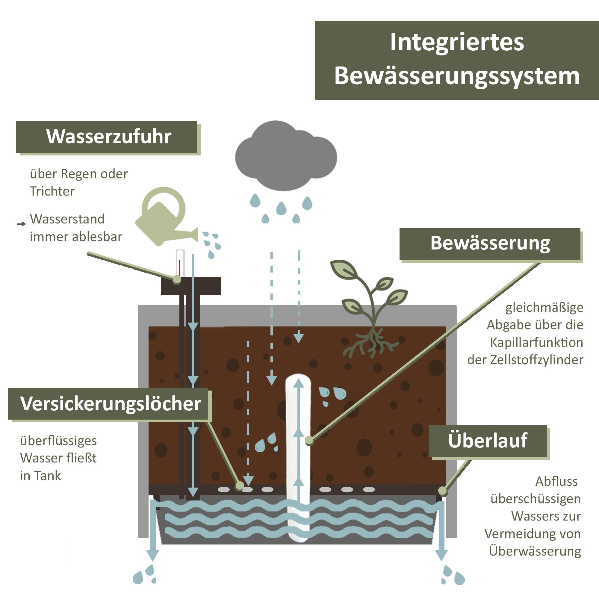- Überlaufventil verhindert Staunässe in der Erde (keine Drainage erforderlich)