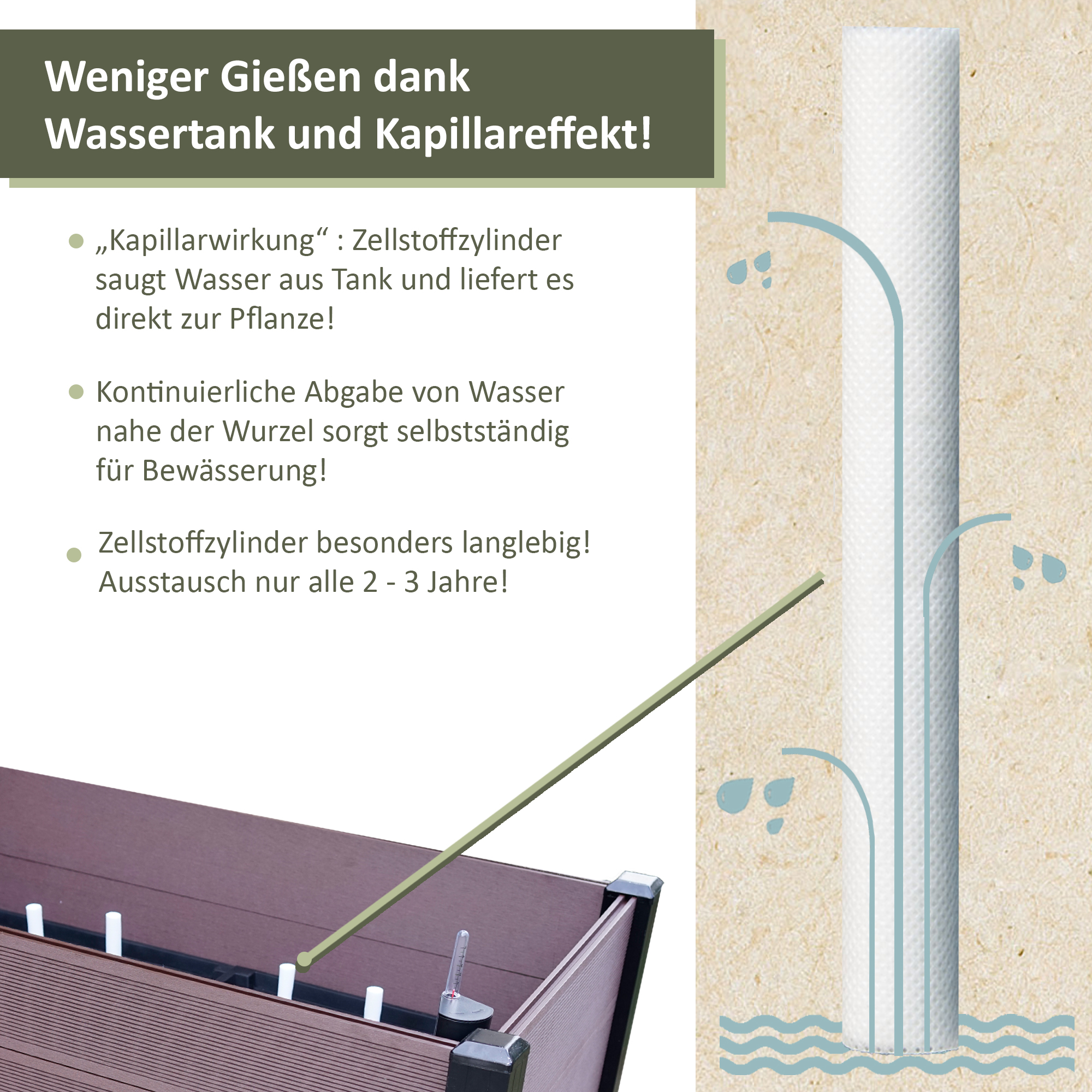 Unser Hochbeet verfügt über ein intelligentes, patentiertes Bewässerungssystem, das eine optimale Versorgung der Pflanzen sicherstellt und auf der Kapillarwirkung basiert. Dabei werden Zellstoffzylinder eingesetzt, die kontinuierlich Wasser an die Wurzeln abgeben. Im Vergleich zum herkömmlichen Gießen von oben ist dieses System besonders effizient, da es die Verdunstung reduziert. Außerdem wird Staunässe vermieden, was wiederum das Wachstum von Schimmel und Krankheiten verhindert. Eine Wasserstandsanzeige gibt Dir jederzeit Auskunft über den Füllstand des Wasserreservoirs.