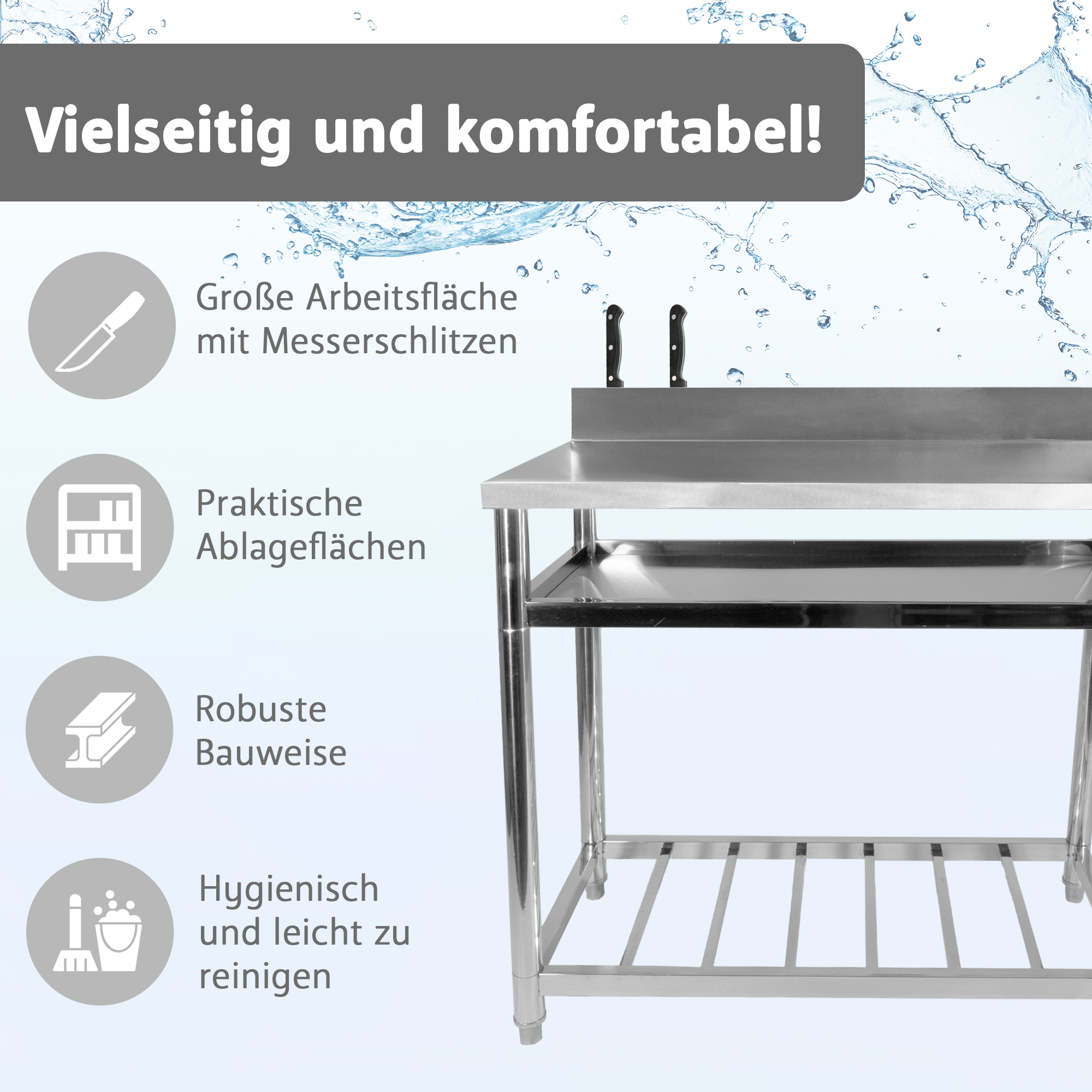 - Mit zwei großzügigen Ablageflächen und Messerhalterung