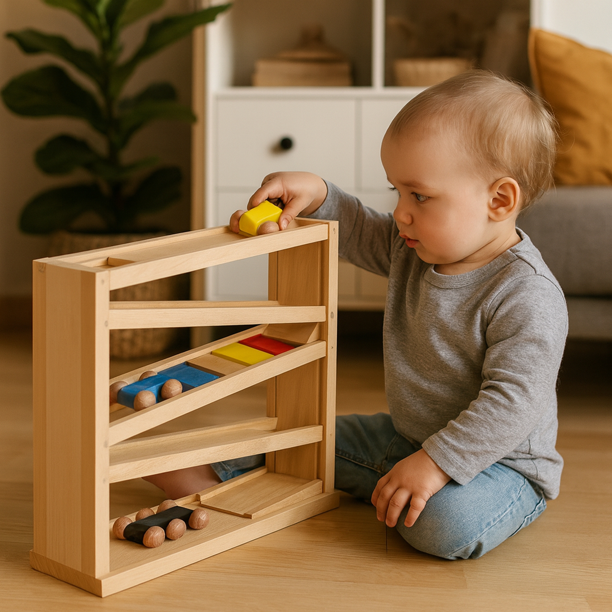 - Erstes Verständnis für Physik – rollende Autos und Kugeln zeigen Geschwindigkeit, Schwerkraft und Ursache-Wirkung
