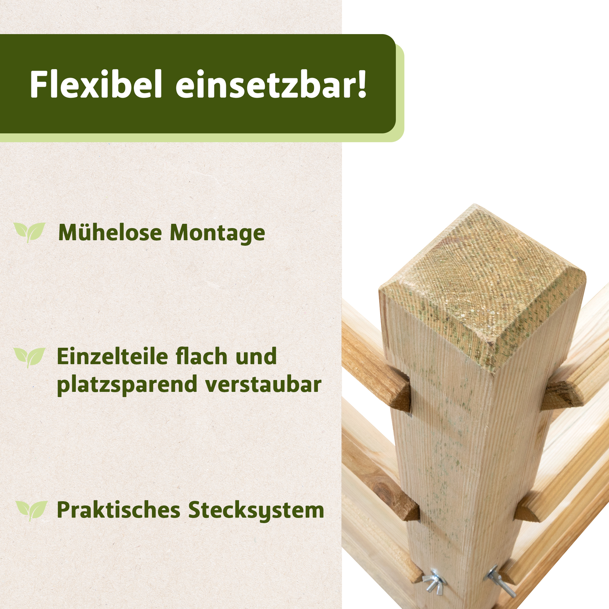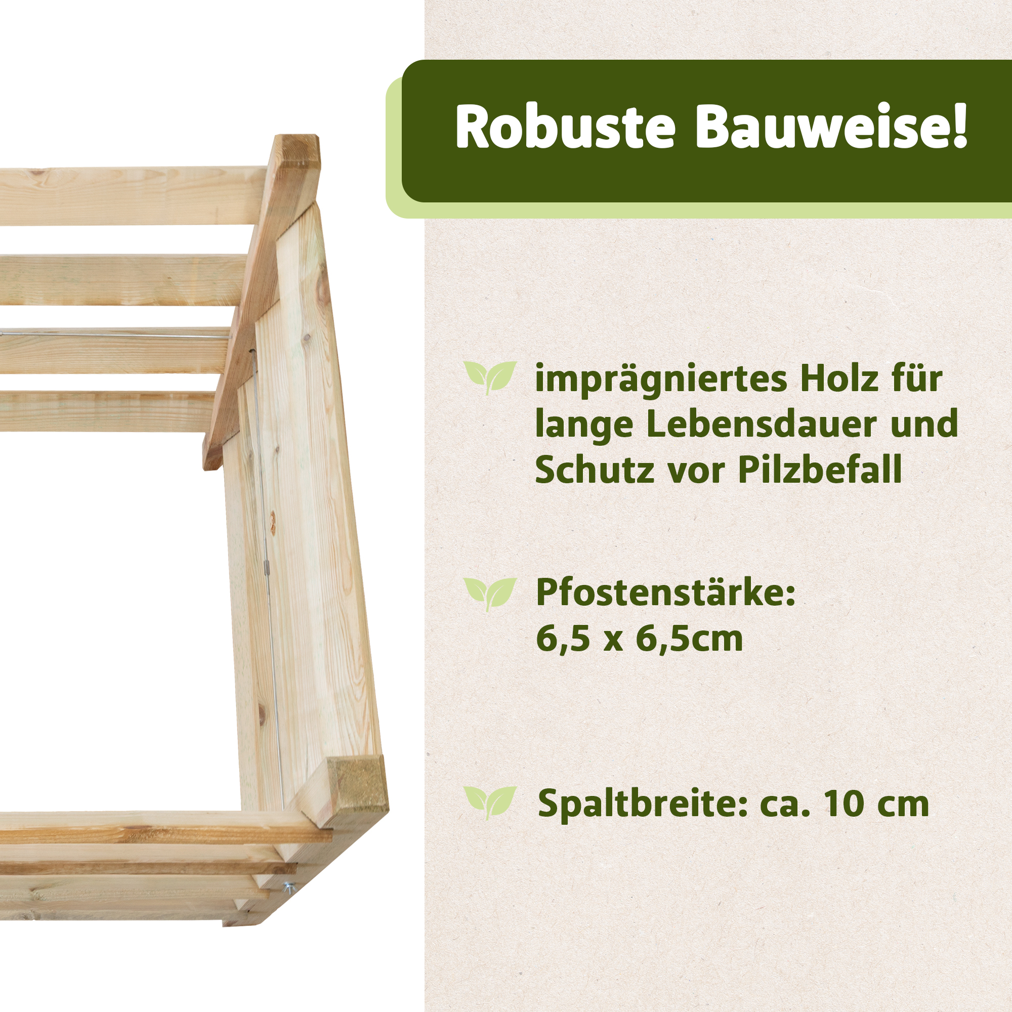 - imprägniertes Holz für lange Lebensdauer und Schutz vor Pilzbefall