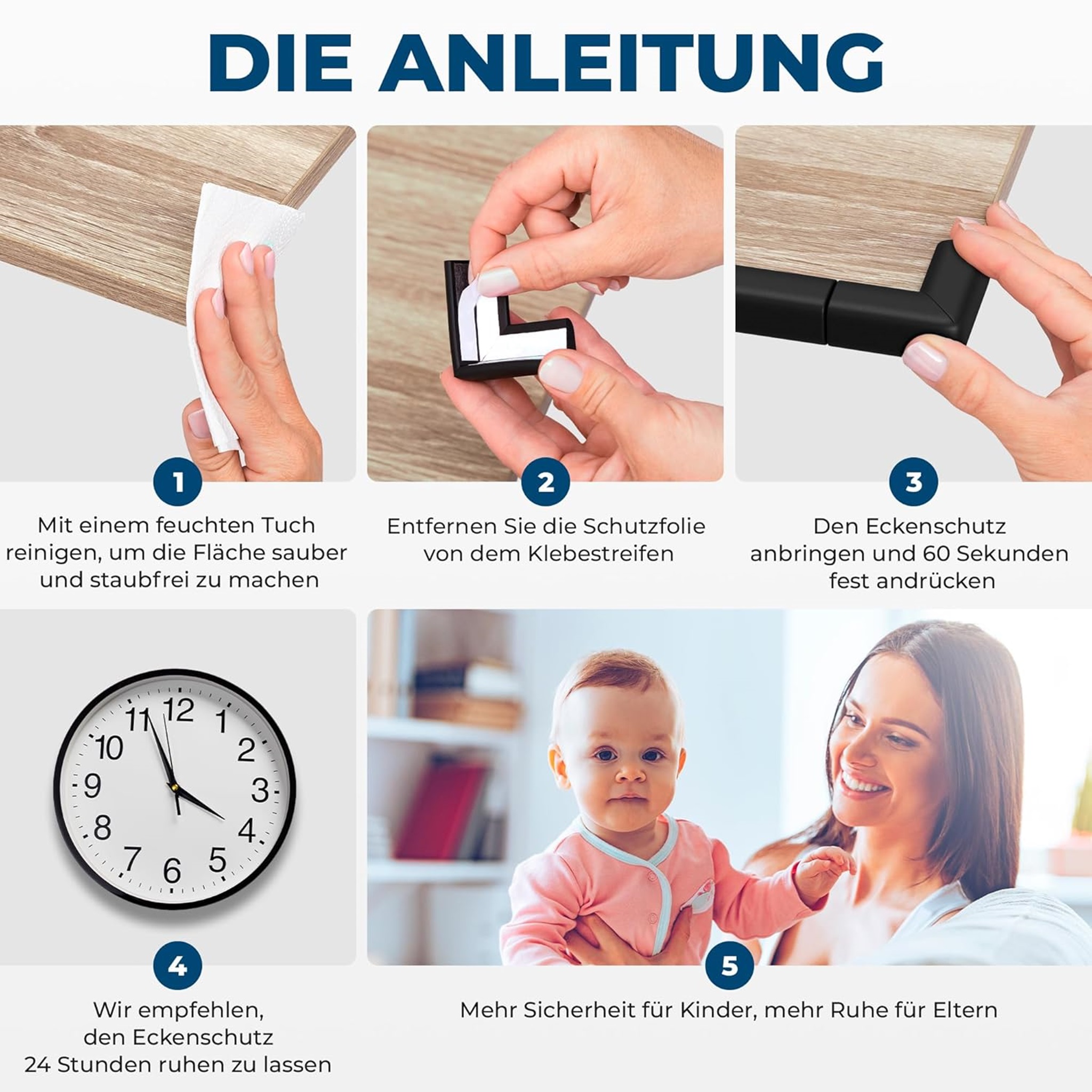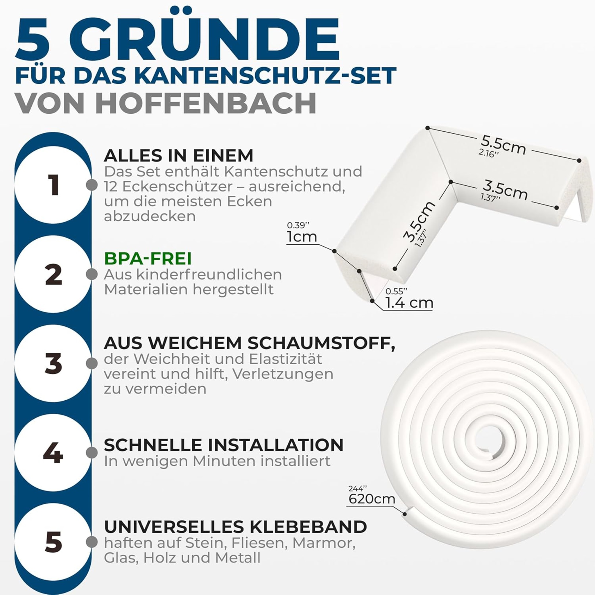 Dank jahrelanger Erfahrung hat die deutsche Marke Hoffenbach ein Kindersicherungs-Set entwickelt, welches ihre Kinder vor den meisten Gefahren in Ihrem Zuhause schützt. Tischschutz, Eckschutz und Türstopper sind selbstklebend und aus einem weichen und geruchlosen Material (BPA frei) hergestellt, was für die Gesundheit Ihres Babys von höchster Bedeutung ist. Bombenfester Halt und rückstandslose Entfernung sind durch die innovativen Klebesteifen von 3M gewährleistet; Extra verdichteter Schaumstoff mit 8mm Dicke bietet den Schutz auch bei stärkeren Schlägen.