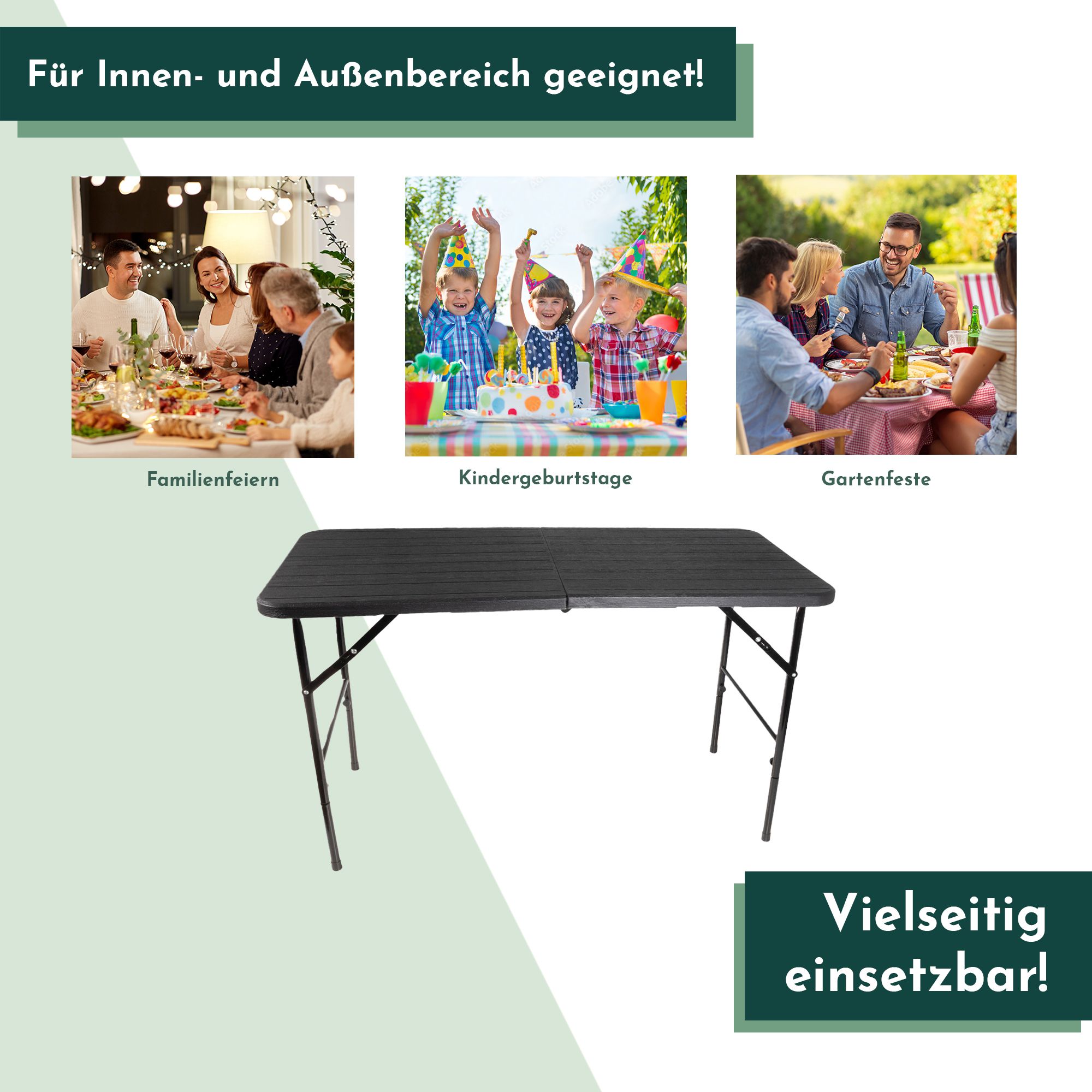 Im Außenbereich kann er als Gartentisch dienen, der sich perfekt für Mahlzeiten im Freien, Gartenpartys oder entspannte Nachmittage im Garten eignet. Du kannst ihn auch als Campingtisch verwenden, wenn Du unterwegs bist und eine stabile Oberfläche zum Essen oder für andere Aktivitäten benötigst.