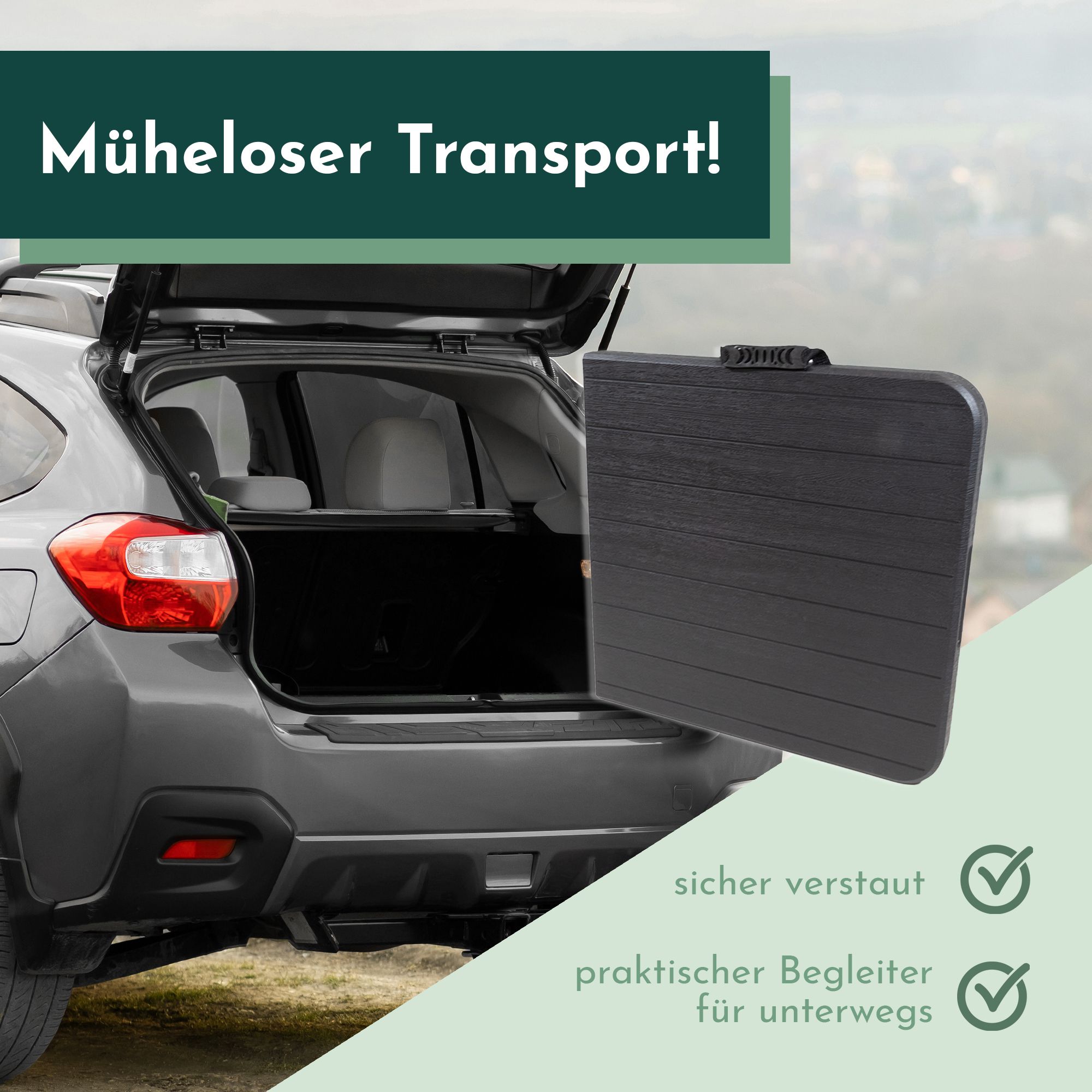 Der Koffertisch ist mit einer praktischen Klappfunktion ausgestattet, sodass du ihn bei Nichtgebrauch einfach flach zusammenklappen und platzsparend verstauen kannst. Dank integrierter Trageschlaufe kannst Du den Koffertisch auch einfach tragen. Dies ist besonders vorteilhaft für Räume mit begrenztem Platzangebot wie kleine Wohnungen oder enge Balkone. Du kannst den Balkon Tisch bei Bedarf schnell aufklappen und nach Gebrauch wieder zusammenklappen, um wertvollen Raum zu sparen.