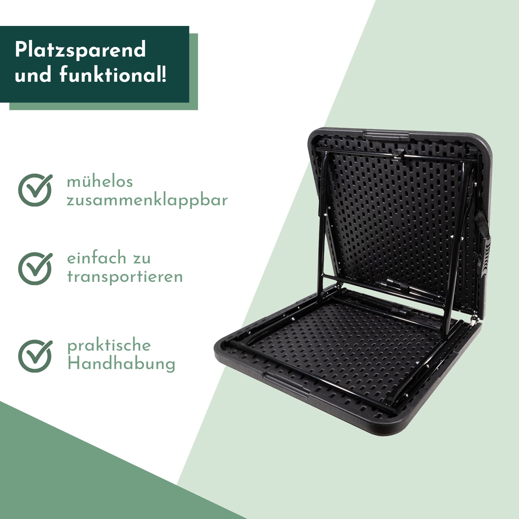 Du kannst den Tisch ganz einfach bei Bedarf aufklappen und ihn anschließend wieder zusammenklappen, um ihn platzsparend zu verstauen. Wenn du beispielsweise Gäste empfängst und zusätzliche Ablagefläche benötigst, ist der Plastiktisch schnell zur Hand. Sobald du ihn nicht mehr benötigst, kannst du ihn mühelos zusammenklappen und zur Seite stellen.