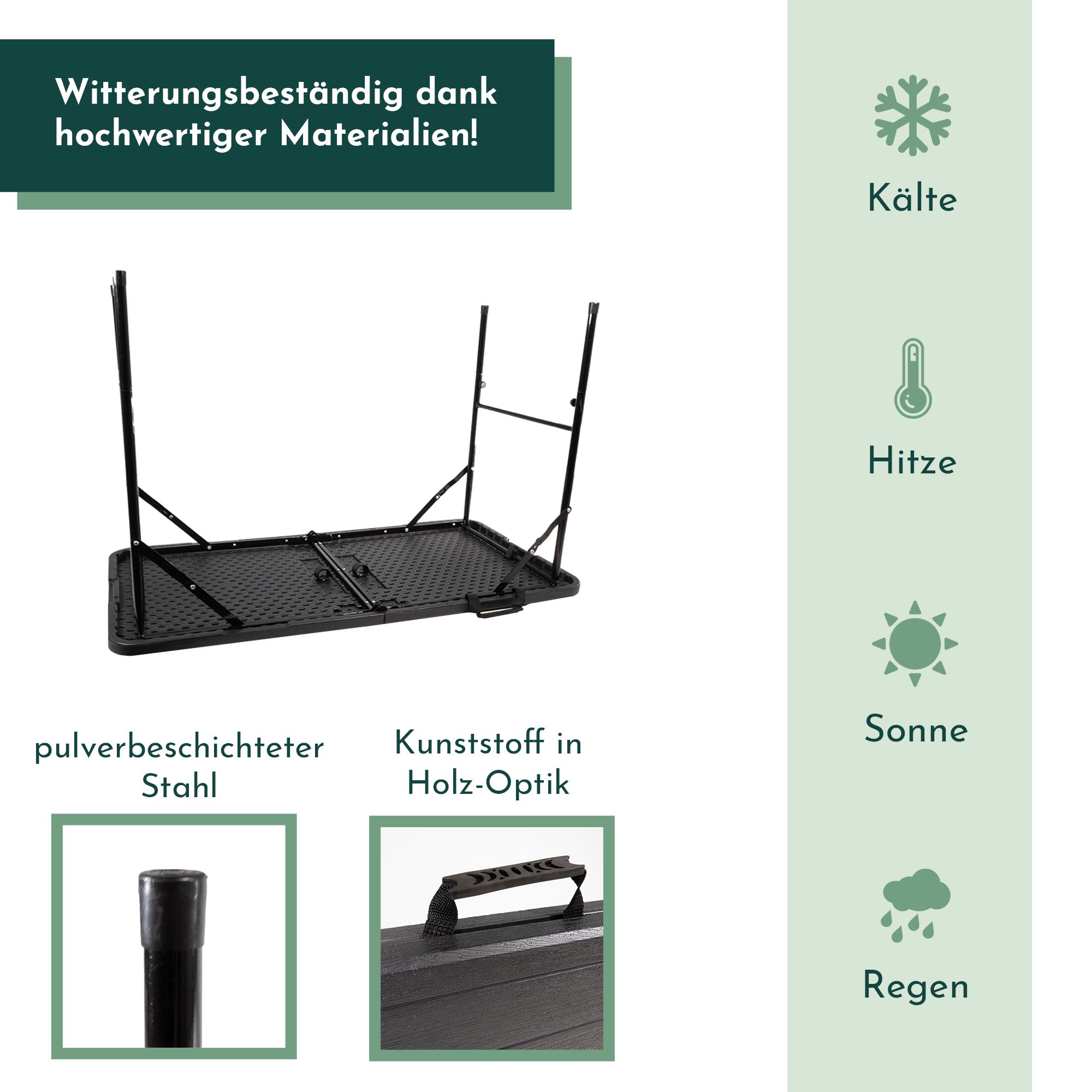 Die Konstruktion des Garten Tisches ist zuverlässig und sicher. Er verfügt über eine Sicherheitsarretierung, die ein ungewolltes Zusammenklappen verhindert. Die Tischbeine sind aus robustem Metall für zusätzliche Stabilität. Die Tischplatte besteht aus hochwertigem und strapazierfähigem Kunststoff in Holzoptik, der eine gleichmäßige Oberfläche für verschiedene Aktivitäten bietet.