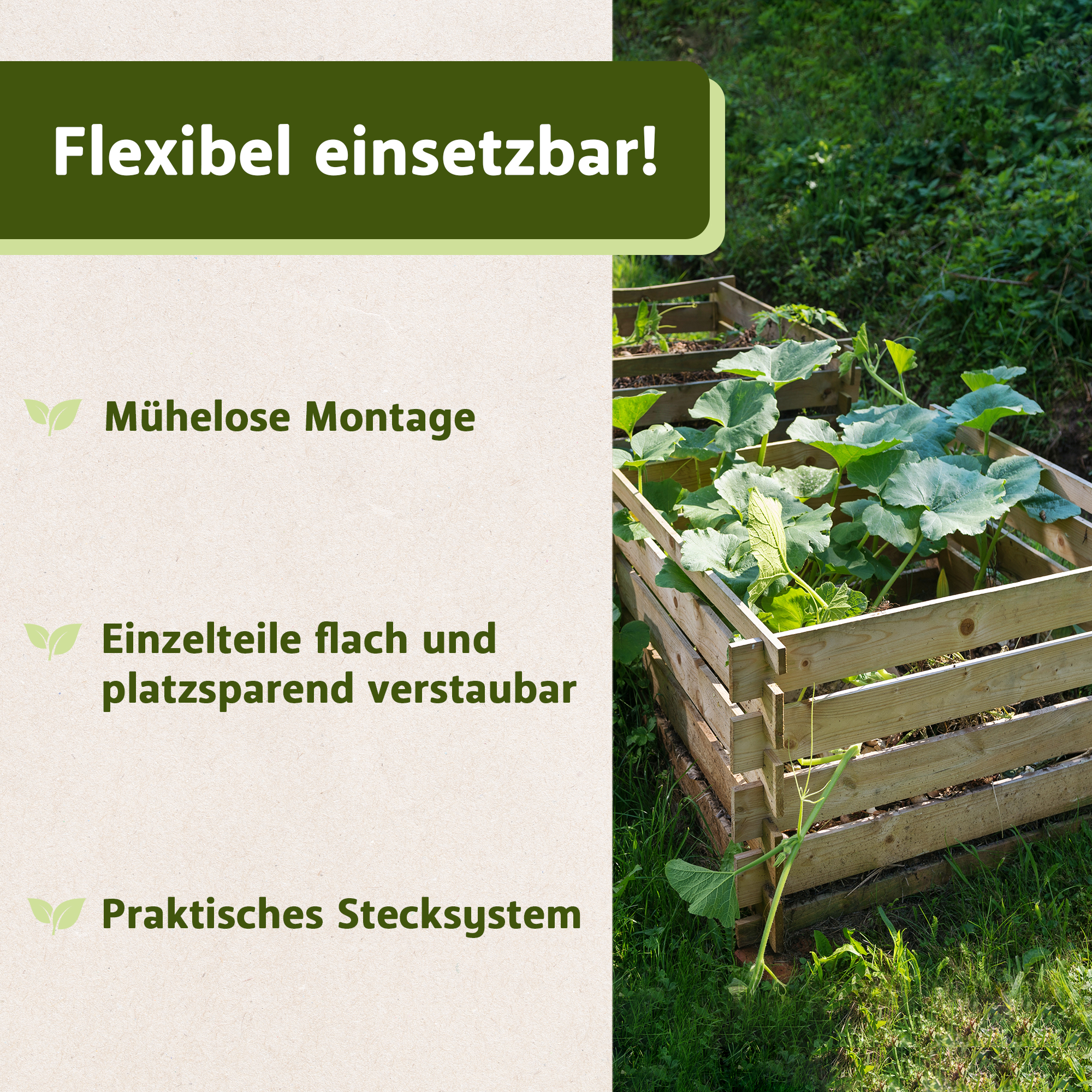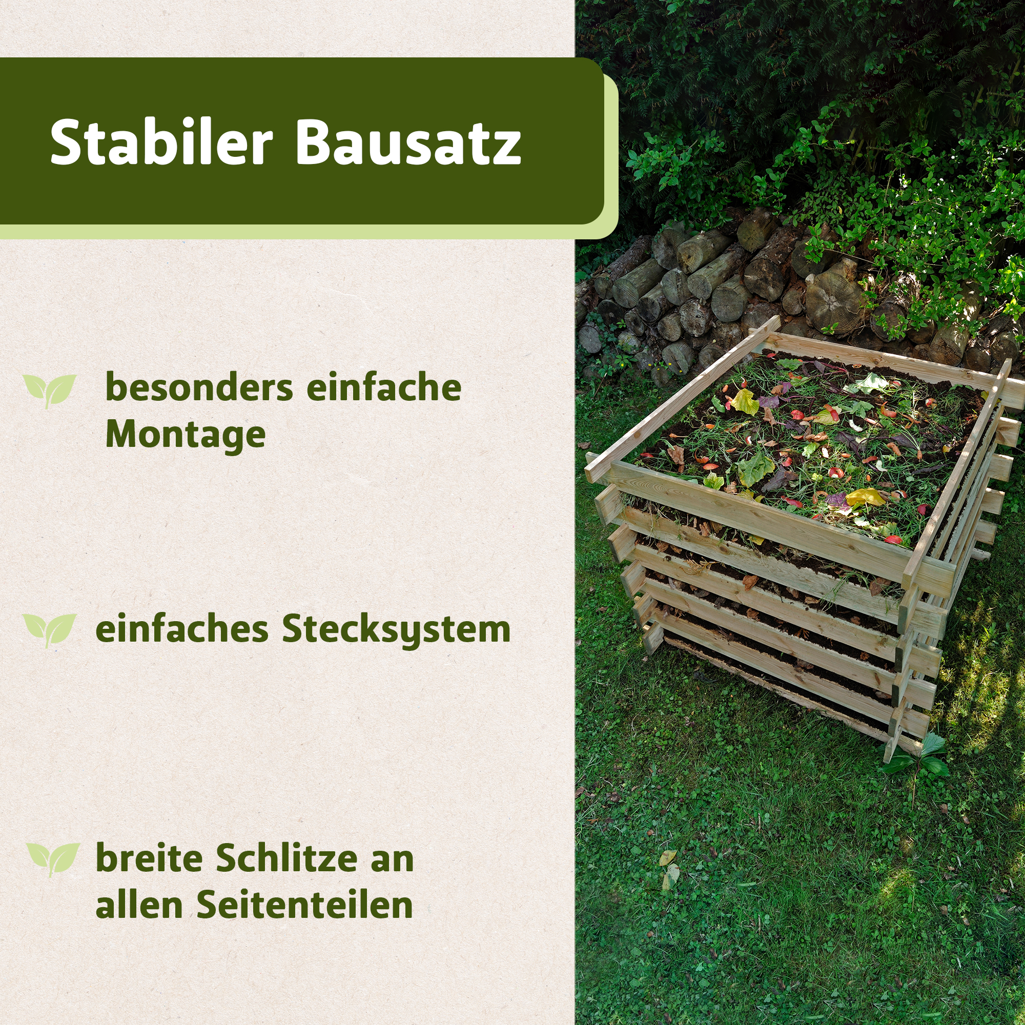 Unser Komposter ist die ideale Lösung für die umweltfreundliche Verwertung von Gartenabfällen und die Produktion nährstoffreichen Komposts. Dieser natürliche Dünger fördert das gesunde Wachstum von Pflanzen und Gemüse und verbessert die Bodenqualität nachhaltig. Dank des praktischen Stecksystems lässt sich der Holzkomposter mühelos und ohne Werkzeug montieren. Eine zusätzliche Metallstange sorgt für extra Stabilität, sodass der Komposter sicher und langlebig bleibt. Der komplette Bausatz ist im Lieferumfang enthalten, sodass der Aufbau schnell und unkompliziert gelingt. Gefertigt aus kesseldruckimprägniertem Holz, überzeugt unser Gartenkomposter durch hohe Widerstandsfähigkeit und Wetterbeständigkeit. Mit einem großzügigen Fassungsvermögen von 570 Litern bietet er ausreichend Platz für große Mengen an organischen Abfällen – ideal für Haushalte mit hohem Biomüllaufkommen. Ein weiteres Highlight ist die platzsparende Konstruktion: Bei Nichtgebrauch kann der Komposter mühelos demontiert und kompakt verstaut werden. Diese flexible Handhabung macht ihn zu einer praktischen und effizienten Lösung für Gärten jeder Größe. Unser Steckkomposter vereint einfache Handhabung, Stabilität und Nachhaltigkeit – für eine umweltfreundliche Gartenpflege und die optimale Verwertung organischer Abfälle. Produktdetails: Material: Holz FSC-zertifiziert (Kiefer) Außenmaß: ca. 100 x 100 x 80 cm (L x B x H) Innenmaß: ca. 85 x 85 (L x B) Bretthöhe: ca. 8,5 cm Brettstärke: ca. 1,5 cm Spaltbreite: ca. 10 cm Pfostenstärke: 6,5 x 6,5 cm (L x B) imprägniert in grün Gewicht: ca. 19 kg Produktinformationen: imprägniertes Holz für lange Lebensdauer und Schutz vor Pilzbefall einfaches Stecksystem zusätzliche seitliche Metallstreben für mehr Stabilität Seitenbretter alle einzeln entnehmbar breite Schlitze an allen Seitenteilen