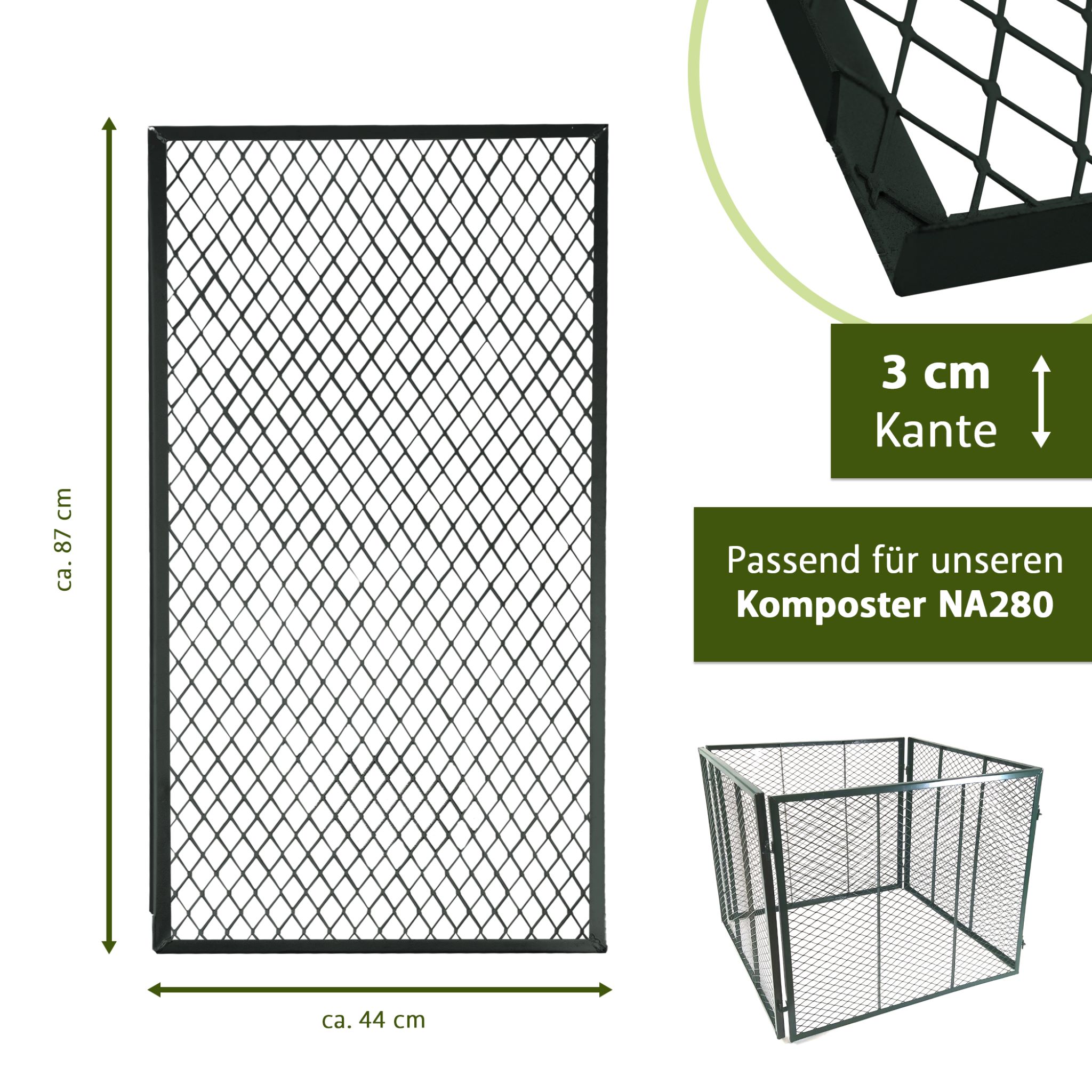 Zum Set gehören der Metallkomposter mit Gitterwänden sowie der zweiteilige Metallgitterdeckel. Beide Komponenten bestehen aus galvanisiertem, pulverbeschichtetem Stahl und sind auf eine langfristige Nutzung im Außenbereich ausgelegt. Die Maschenweite von ca. 35 x 20 mm gewährleistet eine sehr gute Belüftung des Kompostguts, während gleichzeitig kleinere Materialien im Inneren gehalten werden. Dank Stecksystem gelingt die Montage schnell und unkompliziert. Nach Gebrauch lässt sich der Komposter im Handumdrehen zerlegen und platzsparend verstauen. Mit diesem Komposter mit Deckel erhältst du ein durchdachtes, langlebiges System, das dir hilft, organische Abfälle sinnvoll zu verwerten, Kosten für zusätzliche Erde oder Dünger zu reduzieren und deinen Garten nachhaltig zu pflegen.