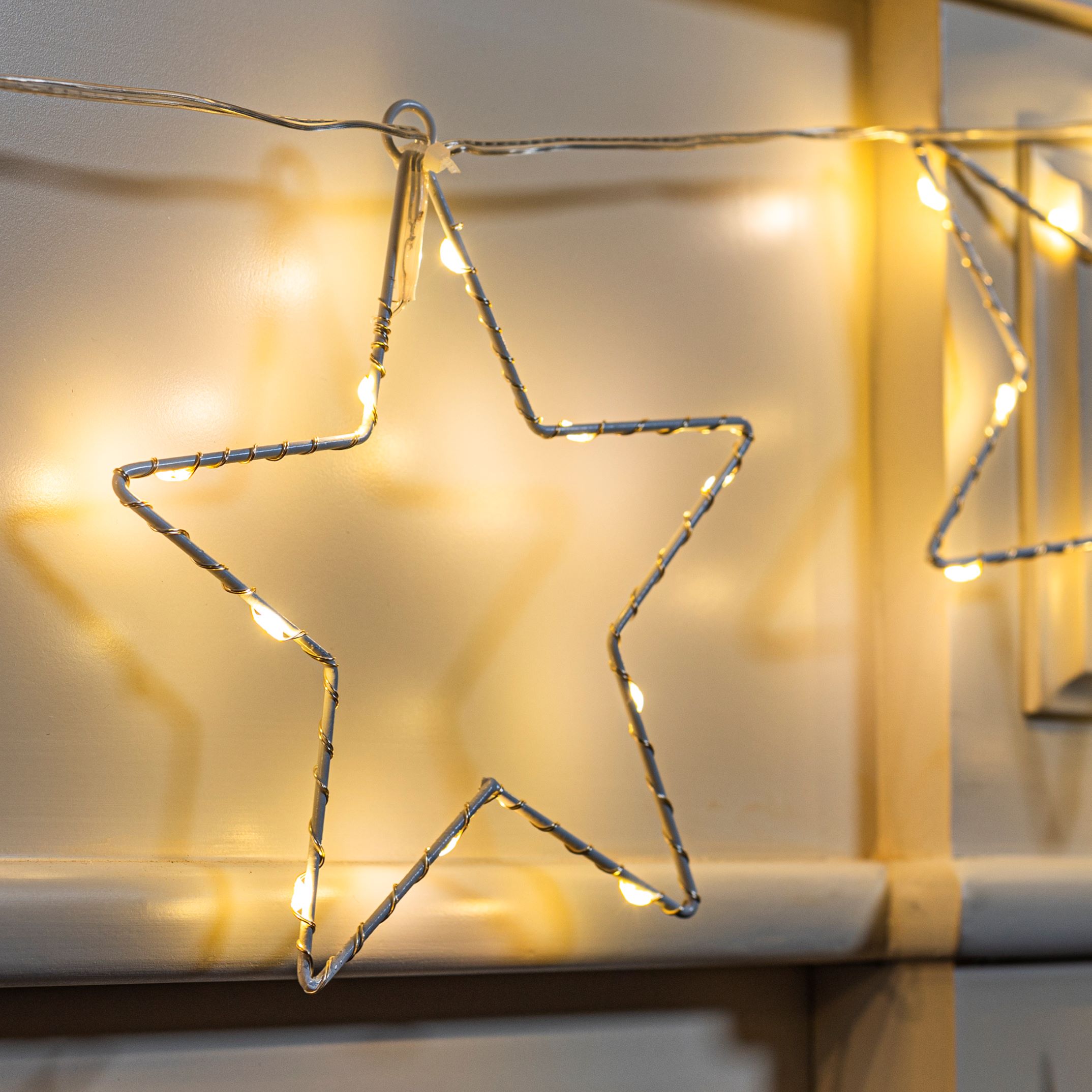 Verleihe deinem Zuhause eine gemütliche und festliche Atmosphäre mit dieser wunderschönen LED-Sternenlichterkette. Die acht Sterne mit jeweils ca. 15 cm Durchmesser sorgen dank insgesamt 80 warmweißen LEDs für ein stimmungsvolles Lichtspiel – ideal für Fenster, Wände oder andere dekorative Bereiche. Dank der praktischen Zuleitung von ca. 30 cm sowie vier Saugnäpfen mit Haken lässt sich die Lichterkette mühelos und flexibel befestigen. Der Abstand zwischen den Sternen beträgt ca. 25 cm, wodurch ein harmonisches Gesamtbild entsteht. Die Beleuchtung wird mit 3x AA-Batterien betrieben (nicht im Lieferumfang enthalten), sodass du völlig unabhängig von Steckdosen dekorieren kannst.