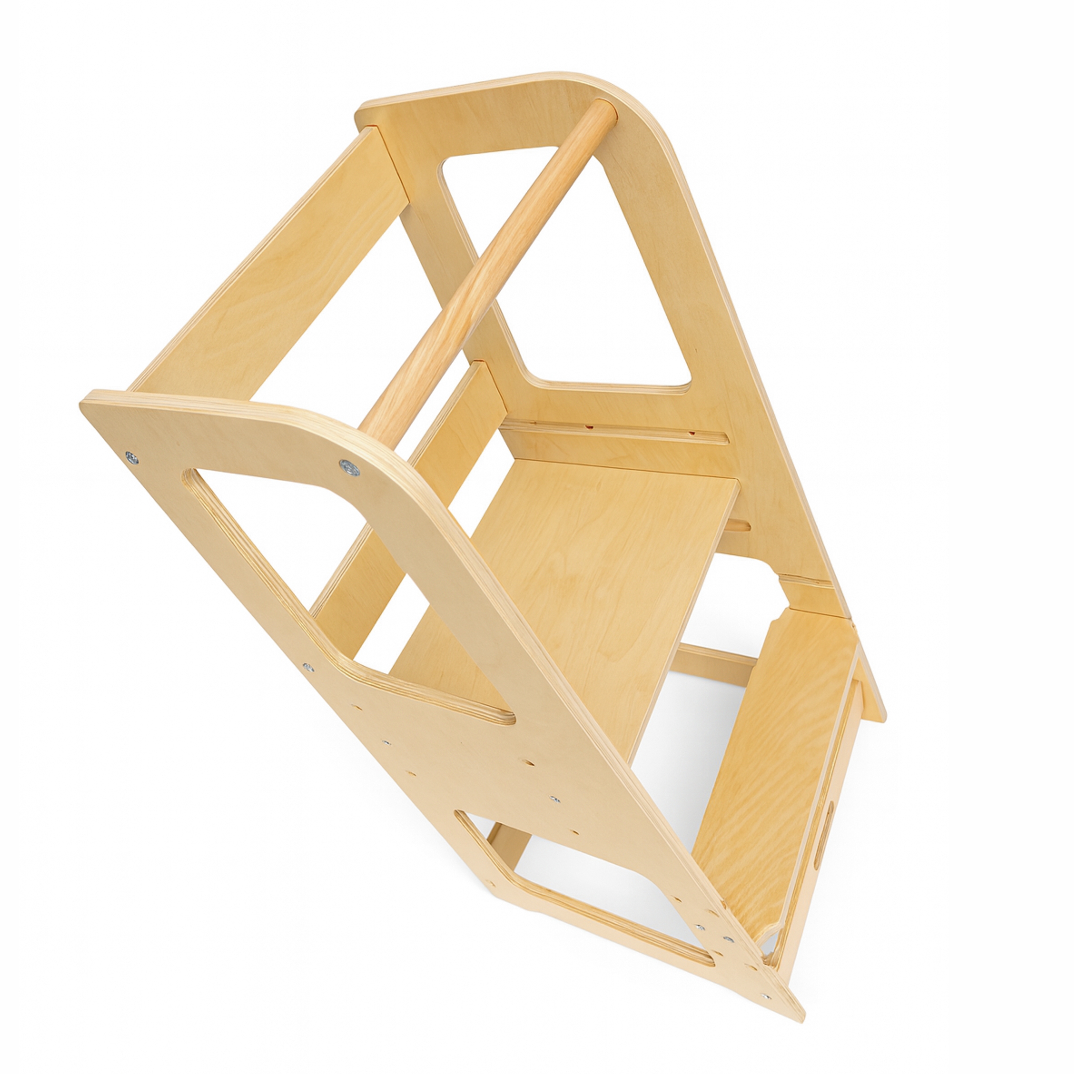 Schon kleine Kinder möchten überall dabei sein: beim Kochen, Backen, Zähneputzen oder Basteln. Gleichzeitig weißt du, wie unsicher ein Stuhl oder Hocker sein kann, wenn dein Kind darauf herumklettert. Der Lernturm für Kinder ab 1 Jahr aus Birkenholz löst genau dieses Problem: Er bringt dein Kind sicher auf Augenhöhe, ohne dass du ständig Angst haben musst, dass es abrutscht oder fällt. So habt ihr beide die Hände frei – du zum Arbeiten, dein Kind zum Mithelfen, Spielen und Entdecken. Der Lernturm verbindet die Montessori-Idee der Selbstständigkeit mit einem durchdachten, platzsparenden Design. Dein Kind kann eigenständig hinaufsteigen, sich an den seitlichen Elementen festhalten und stabil stehen. Die höhenverstellbare Standfläche sorgt dafür, dass der Turm mit deinem Kind mitwächst und über mehrere Jahre hinweg genutzt werden kann.