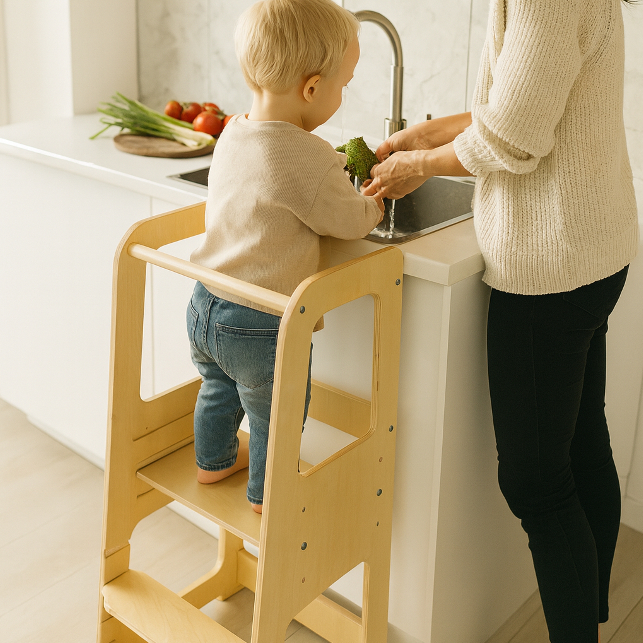 Ein Lernturm ist ein erhöhter Tritthocker mit seitlicher Umrandung, der Kinder sicher auf Arbeitsplatten- oder Waschbeckenhöhe bringt. Im Unterschied zu einem normalen Hocker steht dein Kind geschützt in einer Art Rahmen und kann sich nicht so leicht zur Seite wegkippen. Unser Lernturm für Kinder ab 1 Jahr besteht aus stabilem Birkenholz und ist so konstruiert, dass dein Kind sicher und bequem darin stehen kann. Für Eltern bedeutet das: weniger Stress im Alltag, weil dein Kind nicht mehr auf unsichere Möbel klettern muss. Für dein Kind bedeutet es: mehr Nähe, mehr Beteiligung und mehr Möglichkeiten, selbst aktiv zu werden – ganz im Sinne der Montessori-Pädagogik.