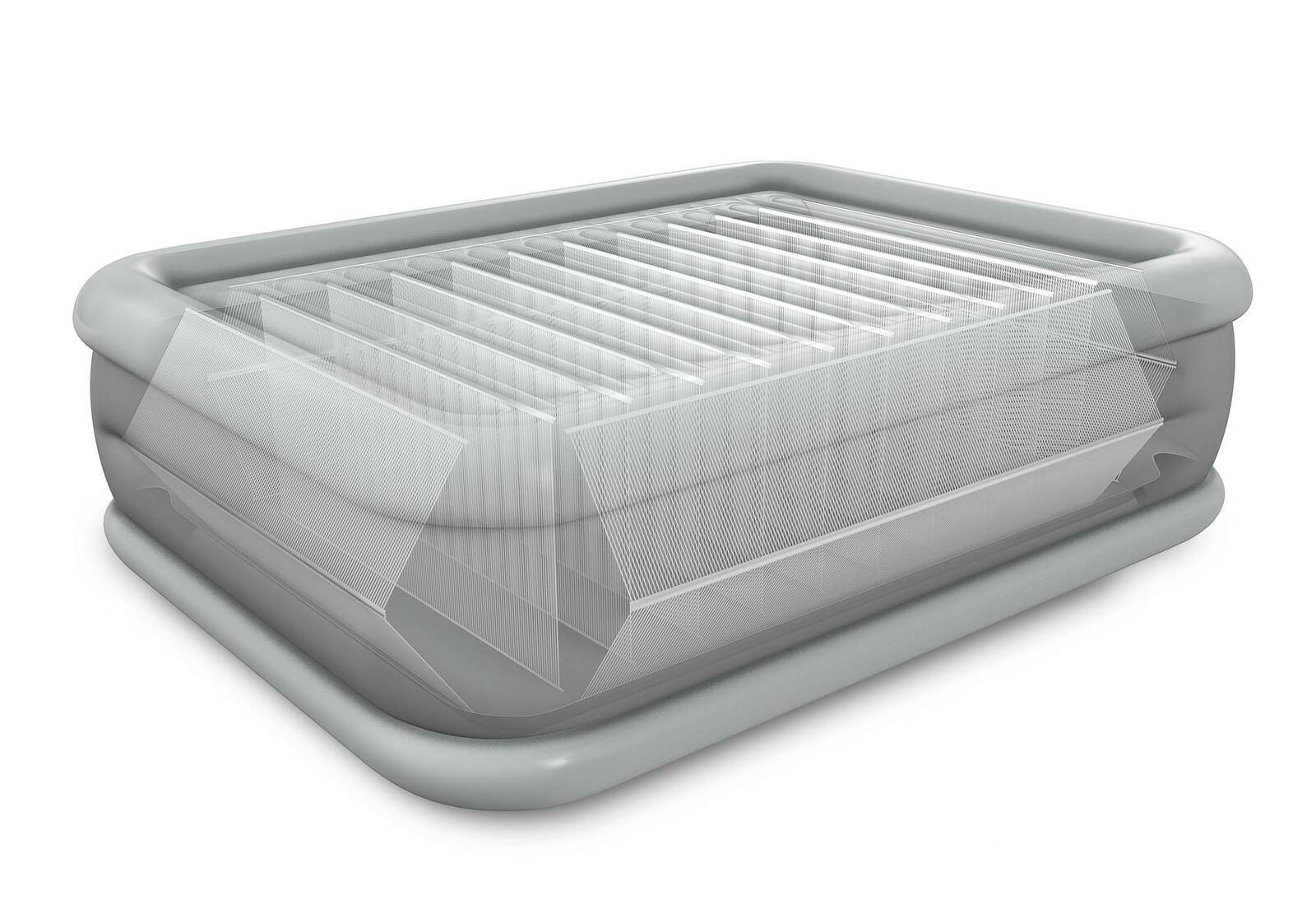 Die 2-Personen Intex Comfort-Plush High Rise 'Queen' Luftmatratze mit den Maßen 152x203x56 cm ist für den Heimgebrauch geeignet. Die Luftmatratze hat eine Höhe von 56 cm, was das Ein- und Aussteigen besonders einfach macht. Die Innenseite der Luftmatratze enthält Polyesterfäden, die von der Ober- zur Unterseite der Luftmatratze verlaufen. Diese Tausenden von Fasern sorgen für perfekte Stabilität und hervorragende Unterstützung des Körpers. Diese innere Struktur mit unterstützten Dura-Beam-Fasern, auch Fiber-Tech-Technologie genannt, ist ein einzigartiges Merkmal dieser Intex-Luftmatratzen und ein Garant für ein angenehmes Schlaferlebnis. Neben der Faser-Tech-Innenausstattung verfügt diese einzigartige Luftmatratze auch über eine einzigartige K-Beam-Randstützkonstruktion, die unvergleichliche Unterstützung und Komfort bietet. Darüber hinaus enthält die Luftmatratze eine interne Quickfill Plus-Pumpe, sodass Sie sie nur einstecken und den Knopf auf „+“ drehen müssen, um die Luftmatratze aufzublasen. Um die Luftmatratze nach Gebrauch zu entleeren, drehen Sie den Knopf auf „-“ und die Luftmatratze entleert sich. Die Luftmatratze hat eine weiche doppellagige Komfortauflage, die für eine glatte Liegefläche sorgt und für einen erholsamen Schlaf sorgt. Im Gegensatz zu den anderen Luftmatratzen haben die Luftmatratzen der Dura-Beam Deluxe-Serie horizontale Balken für den ultimativen Komfort. So schaffen Sie in wenigen Minuten einen schönen Schlafplatz auf dem Campingplatz, an Ihrer Gästeadresse oder für Übernachtungsgäste.