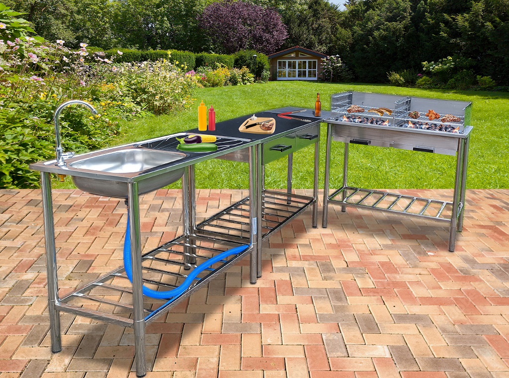 Outdoor-Küche aus Edelstahl, Außenküche zum kochen im Freien, Gartenküche, Grillküche L-Form