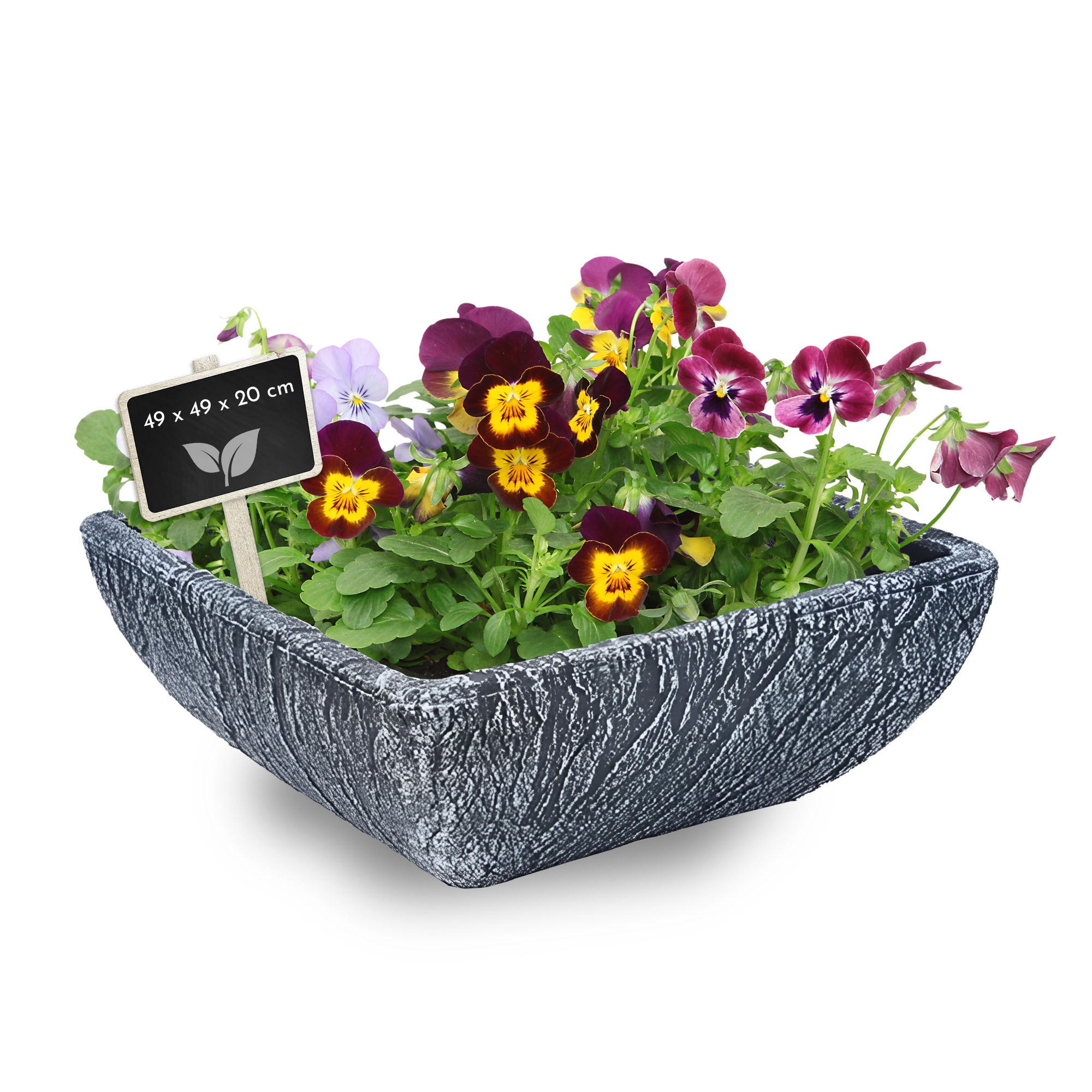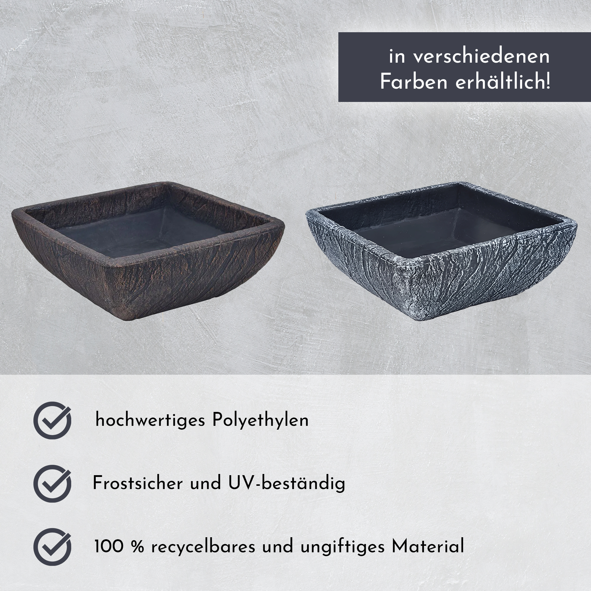 Pflanzschale aus Kunststoff, eckiger Pflanztopf, Grabschale, Stein-Optik