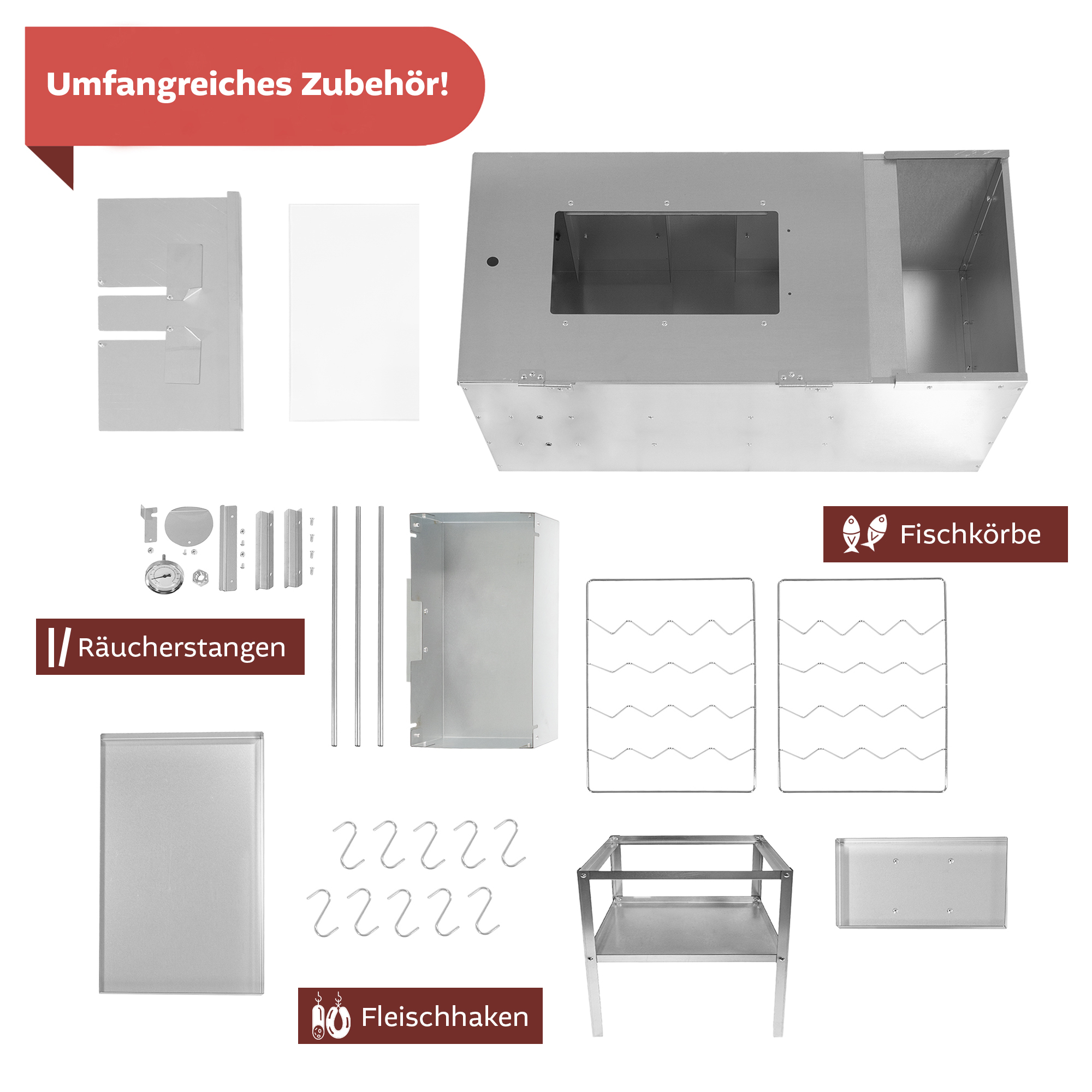 | Ausstattung: | inkl. Fischkörbe, Räucherstangen, Thermometer, mit Unterbau |