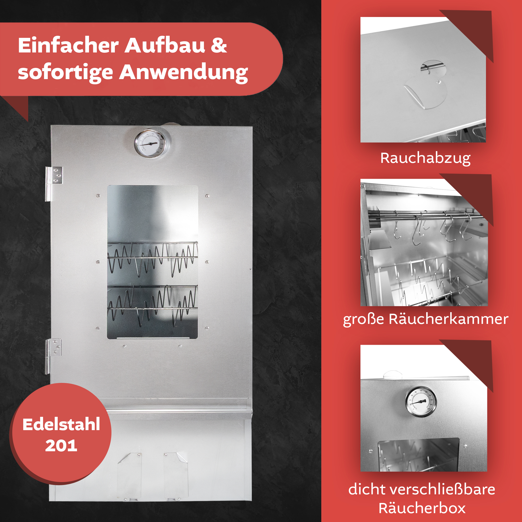 Mit unserem Räucherofen schaffst Du authentisches Aroma in Deine Küche. Ob Fisch, Fleisch, Wurst, Käse oder Gemüse – Du veredelst Deine Lebensmittel selbst und verleihst ihnen eine unverwechselbare Note. Dank vormontierter Lieferung ist der Ofen in wenigen Schritten einsatzbereit und lässt sich ganz unkompliziert aufbauen. Das umfangreiche Zubehör – darunter Thermometer, Fischkörbe, Fleischhaken, Räuchermehlwanne, Glutkasten und Abtropfwanne – ermöglicht Dir einen sofortigen Start. Die integrierte Sichtscheibe erlaubt eine einfache Kontrolle des Räuchervorgangs, ohne die Kammer zu öffnen. Die großzügige Räucherkammer sorgt für gleichmäßige Ergebnisse, während die Abtropfwanne zuverlässig verhindert, dass Fett auf die Glut tropft. Ob Kalträuchern, Warmräuchern oder Heißräuchern – dieser Räucherschrank ist für alle Methoden geeignet und passt sich Deinen kulinarischen Vorlieben flexibel an. Dank stabilem Unterbau steht der Ofen sicher und bietet eine angenehme Arbeitshöhe für komfortables Handling und beste Kontrolle. Entdecke neue Geschmackswelten – mit Deinem eigenen Räucherofen!