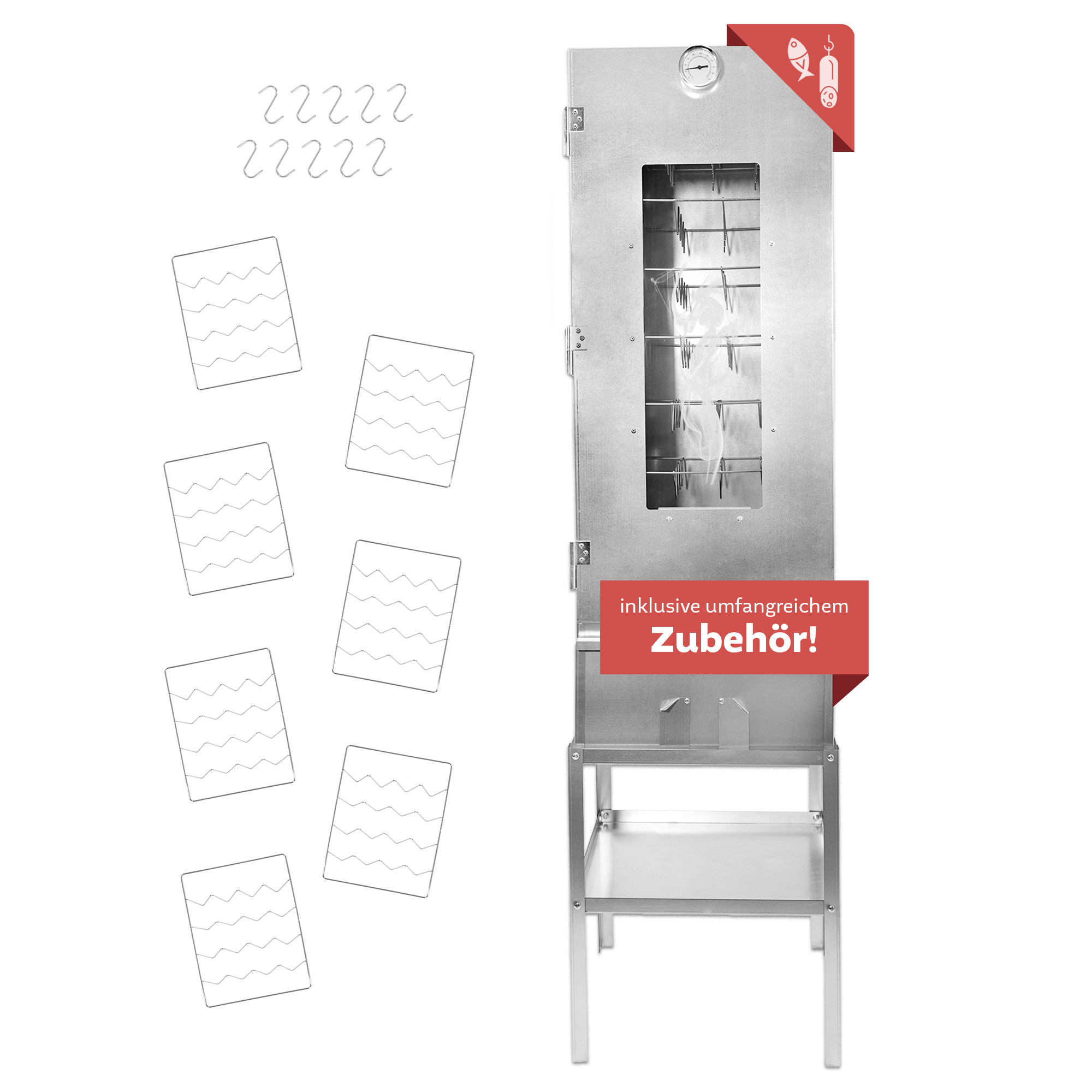 | Ausstattung: | inkl. Fischkörbe, Räucherstangen, Thermometer, mit Unterbau |