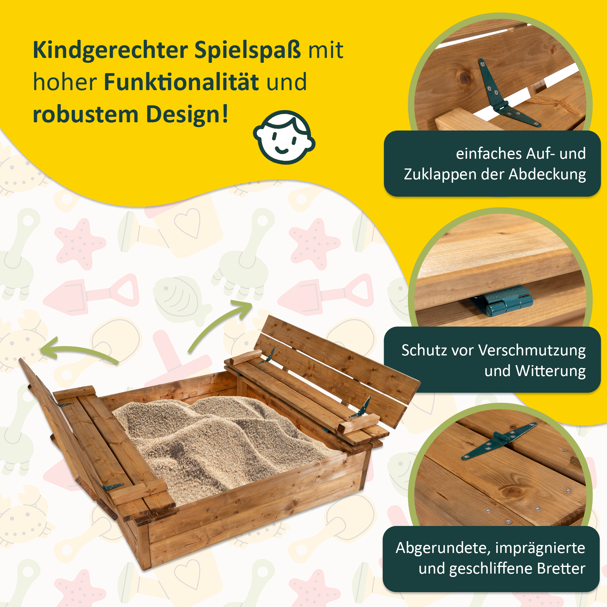 - Abdeckung schützt den Sand vor Verschmutzung und Witterung (mit Schlitzen)