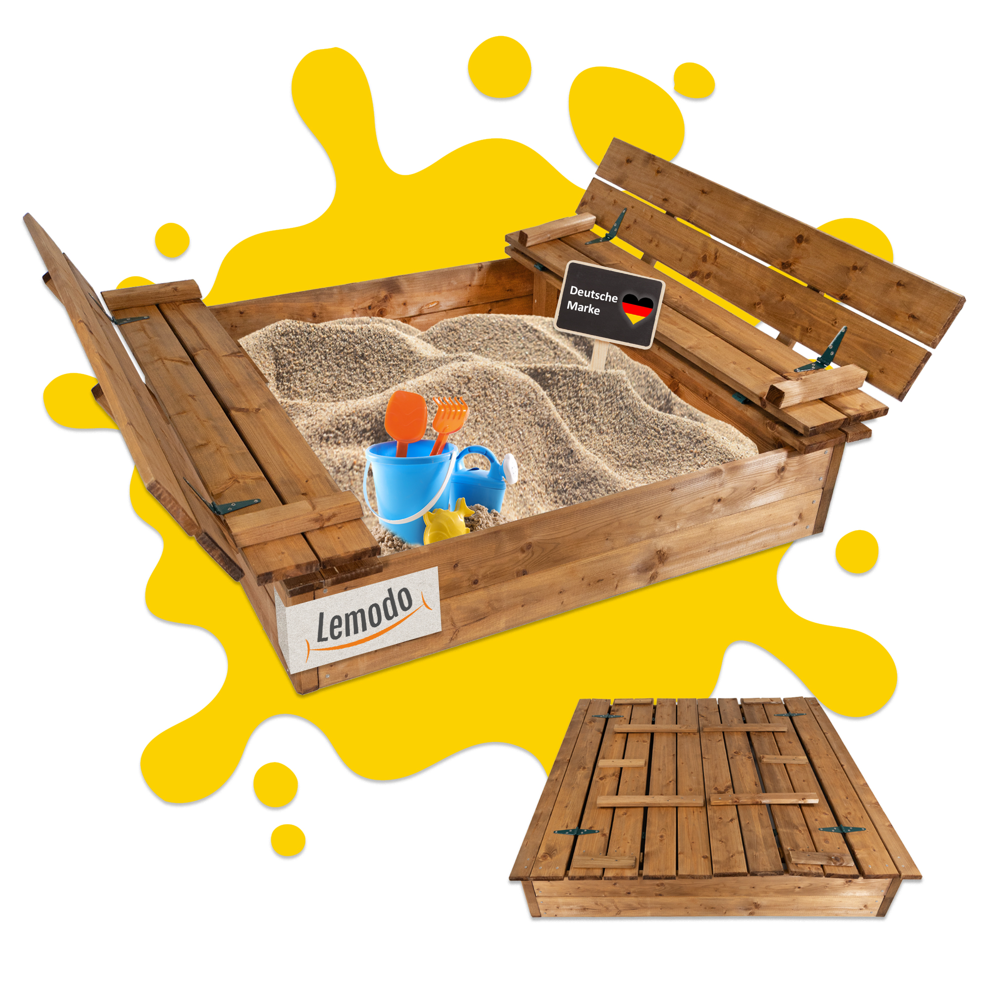 Sandkasten Holz 115x114cm mit Abdeckung und Sitzbänken, braun imprägniert