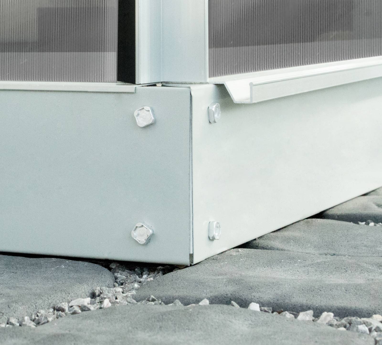 Der Stahlfundamentrahmen liefert einen soliden Unterbau für Ihr Gewächshaus. Eine gerade und ebene Ausrichtung wird dadurch erleichtert. Der Rahmen sitzt direkt unter dem Bodenprofil und erhöht somit die Höhe des Gewächshauses. Er kann - im Gegensatz zu anderen Unterbauen - direkt mit dem Punktfundament verbunden werden. Am Gewächshaus, wird er ohne zusätzliche Schrauben mittels der mitgelieferten Fundamentklammern befestigt.