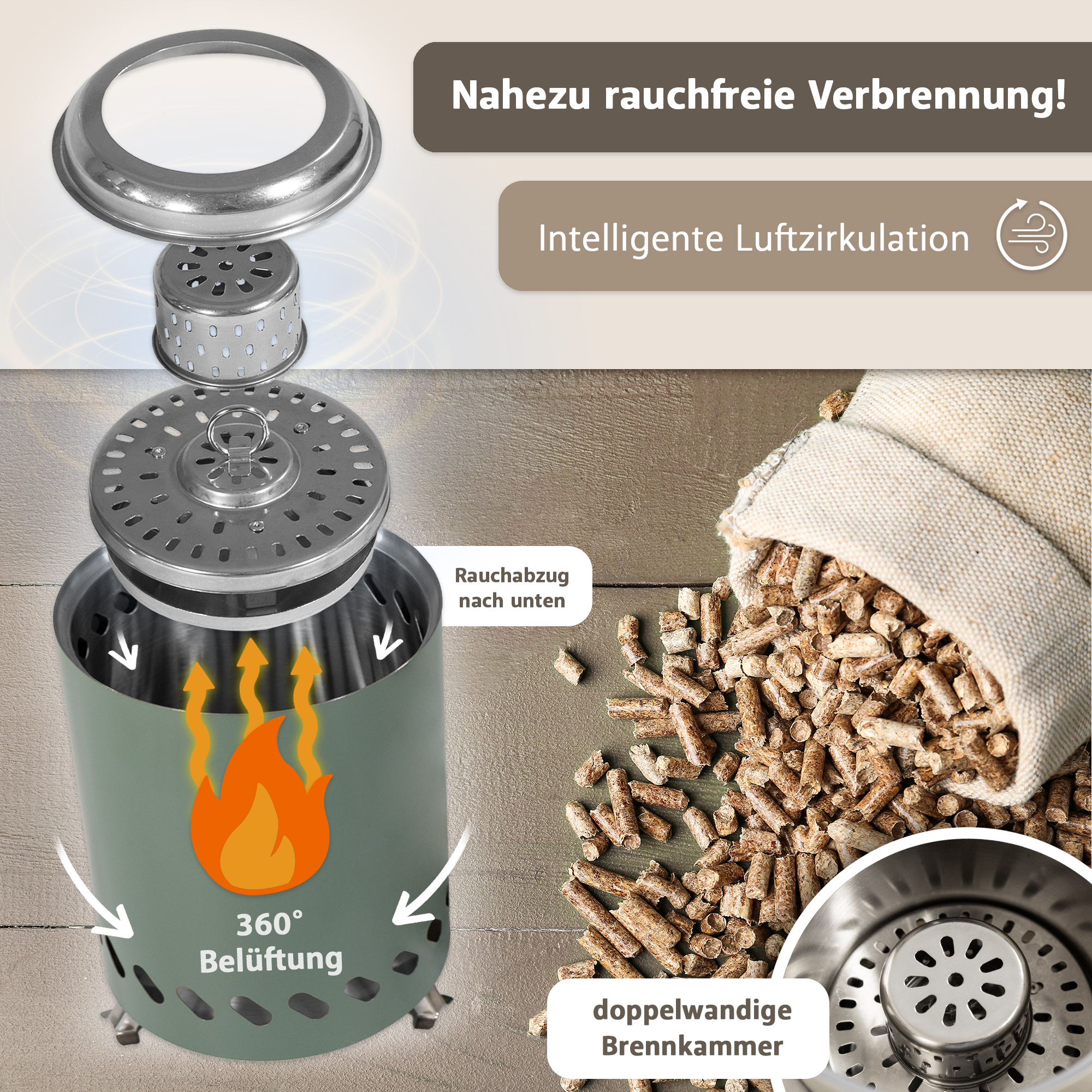 - nahezu rauchfreie Verbrennung (intelligente Luftzirkulation)