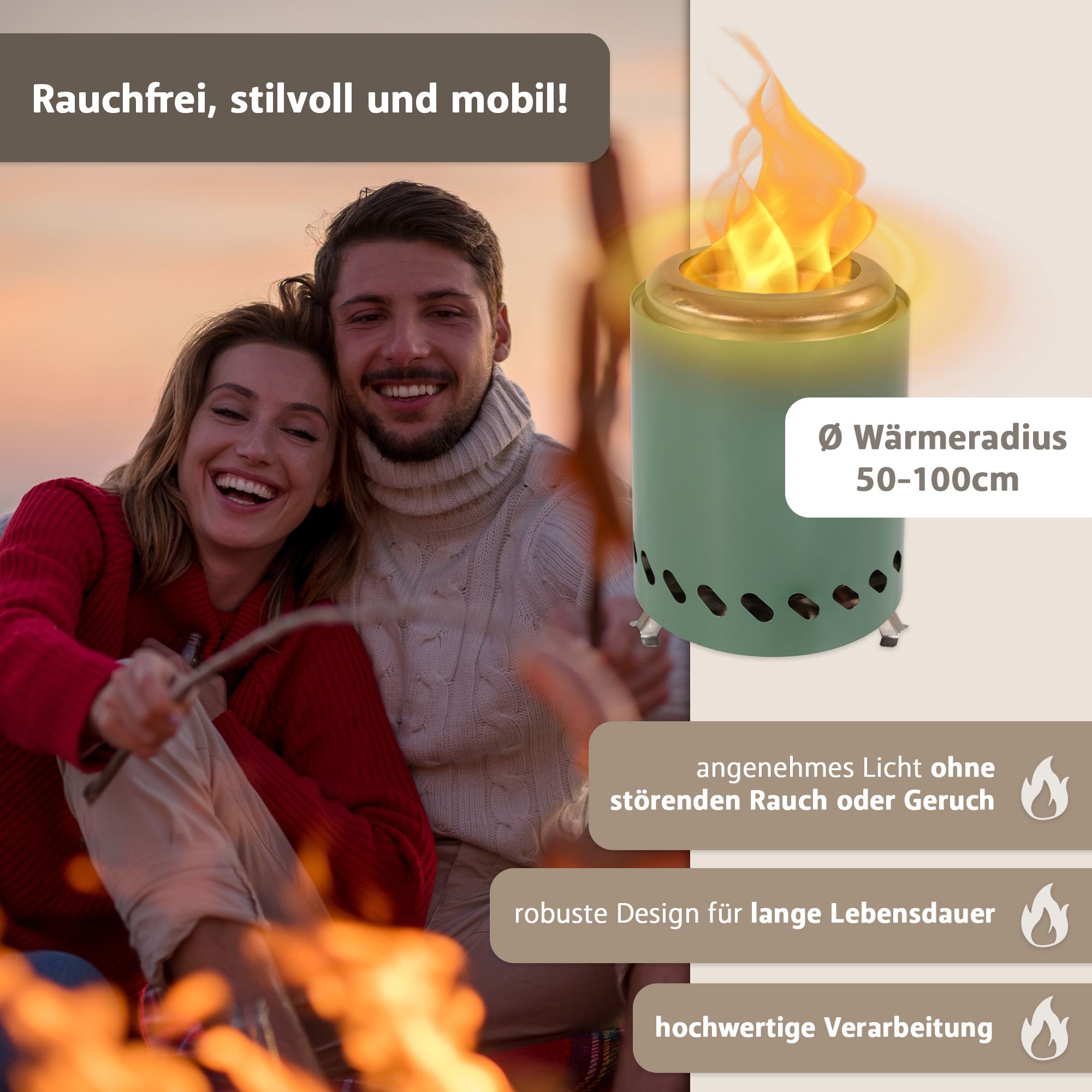 Mit dem Tischkamin entscheidest du dich für ein Outdoor-Accessoire, das Funktion und Design vereint. Es schafft nicht nur Licht und Wärme, sondern auch ein Gefühl von Ruhe und Geborgenheit. Der Fokus liegt auf einfacher Nutzung, hoher Mobilität und einem klaren, stilvollen Erscheinungsbild – ganz ohne Schnickschnack. Dieses Produkt ist gemacht für alle, die draußen leben und genießen möchten, ohne dabei auf Komfort zu verzichten.