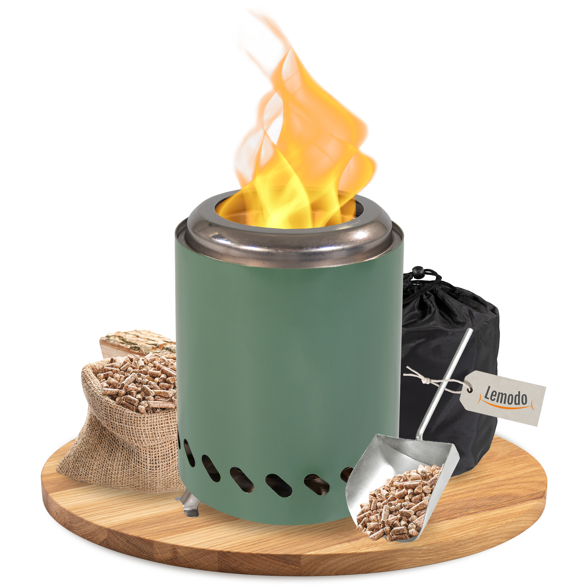 Produktinformationen "Tischkamin grün für Holzpellets, rauchfreies Tischfeuer, Feuerstelle"