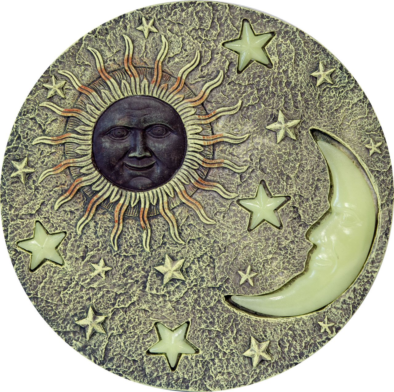 Mit diesen dekorativen Trittsteinen aus wetterfestem Kunststein zaubern Sie einen Hauch von Romantik in Ihren Garten. Die klassischen Motive mit Sonne, Mond und den Himmelsrichtungen sind nicht nur am Tag ein echter Hingucker. In der Dämmerung beginnen die Intarsien der Motive zu leuchten, da das fluoreszierende Material tagsüber das Sonnenlicht absorbiert.