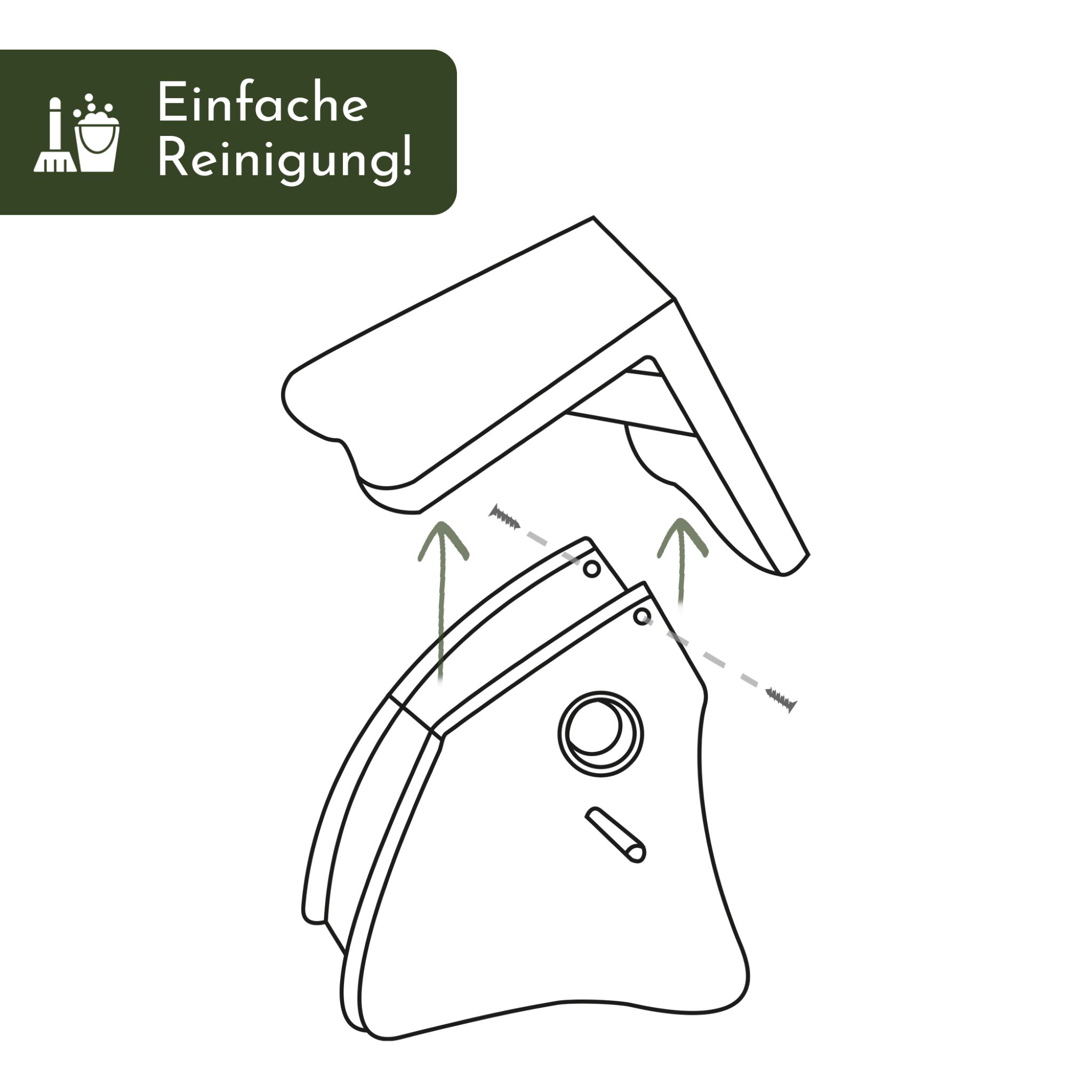 - Dach abnehmbar zum Reinigen des Nistkastens (Schrauben am Dach lösen)