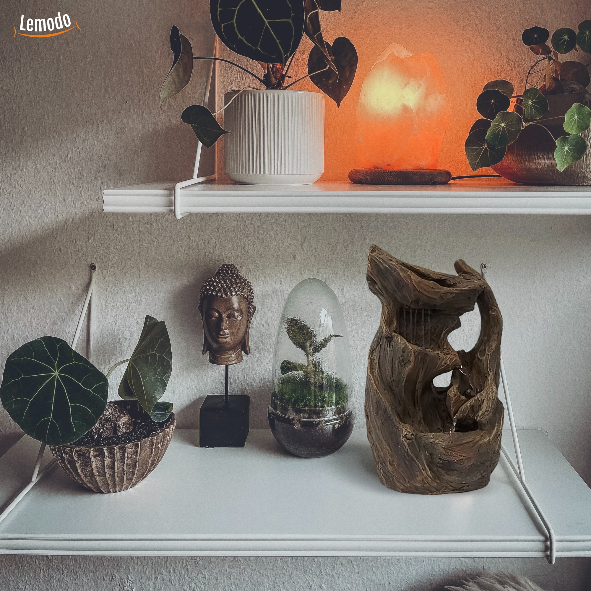 Der Lemodo Zimmerbrunnen bringt Entspannung, Stil und wohltuende Ruhe in dein Zuhause. Mit flüsterleisem Wasserfluss und eleganter LED-Beleuchtung verwandelt er Wohn-, Schlaf- oder Arbeitsbereiche in eine Oase der Gelassenheit. Das sanfte Plätschern beruhigt die Sinne, fördert die Konzentration und reduziert Stress – perfekt für deine tägliche Auszeit. Dank seiner kompakten Maße (32×25,5×67,5 cm) passt der Tischbrunnen auf Sideboards, Beistelltische oder als Blickfang in jede Raumecke. Der widerstandsfähige Kunststoffbehälter ist pflegeleicht, die filigranen Metallblätter setzen dekorative Akzente. Die LEDs erzeugen stimmungsvolles Licht – ideal zum Meditieren, Entspannen oder als harmonische Raumdekoration. Die hochwertige, nahezu lautlose Pumpe sorgt dafür, dass nur das sanfte Plätschern des Wassers hörbar ist – kein Brummen, kein Surren. Der Lemodo Zimmerbrunnen ist nicht nur ein dekoratives Highlight, sondern unterstützt dich dabei, innere Balance zu finden, zur Ruhe zu kommen und neue Energie zu tanken – Tag für Tag. Produktdetails: Material Schale: Kunststoff, Schwarz/Messing Material Brunnen: Metall, Kupfer Maße: 32 x 25,5 x 67,5 cm (L x B x H) Beleuchtung: LED Stromversorgung: 230-240V/50Hz – 12V Pumpe: 5W Kabellänge: ca. 140 cm Produktinformationen: Dekorativer Zimmerbrunnen Hörbarer Wasserfluss wirkt beruhigend und entspannend Sorgt für eine angenehme Atmosphäre Verbessertes Raumklima durch Luftbefeuchtung Mit 4 LEDs in der Auffangschale Inklusive Pumpe und Netzteil