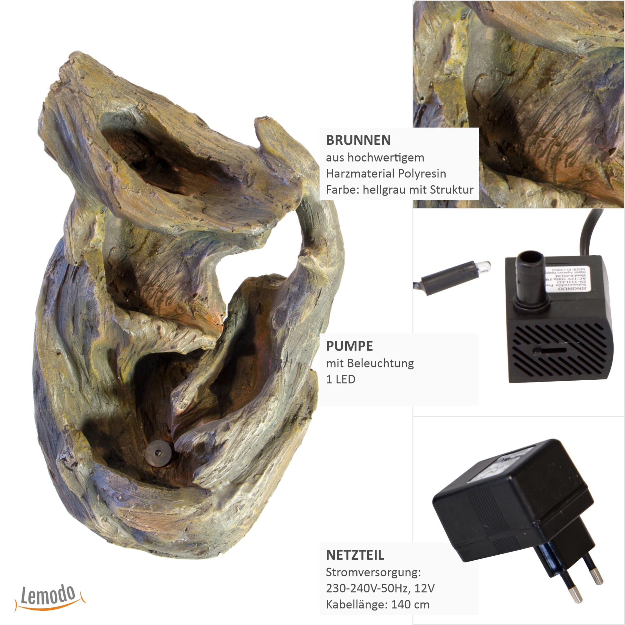 Der Zimmerbrunnen sieht aus wie ein Stück Treibholz oder wie ein Stück einer alten, knorrigen Wurzel. Die Ausarbeitung des Springbrunnens lässt den Betrachter im ersten Moment die Verwendung eines vollkommen natürlichen Materials vermuten.Die Ausarbeitung der verschiedenen Brunnenelemente ist sehr naturnah und sehr realistisch. Auch der Wasserlauf wurde möglichst natürlich gehalten. Der Tischbrunnen verfügt über eine LED Beleuchtung, die den gesamten Springbrunnen in ein sanftes Licht taucht. Durch das immer wieder hineinlaufende Wasser entsteht ein besonderer, lebendiger Lichteffekt. Im Zusammenspiel mit dem sanften Plätschern des Wassers entsteht eine angenehme, wohltuende Atmosphäre.