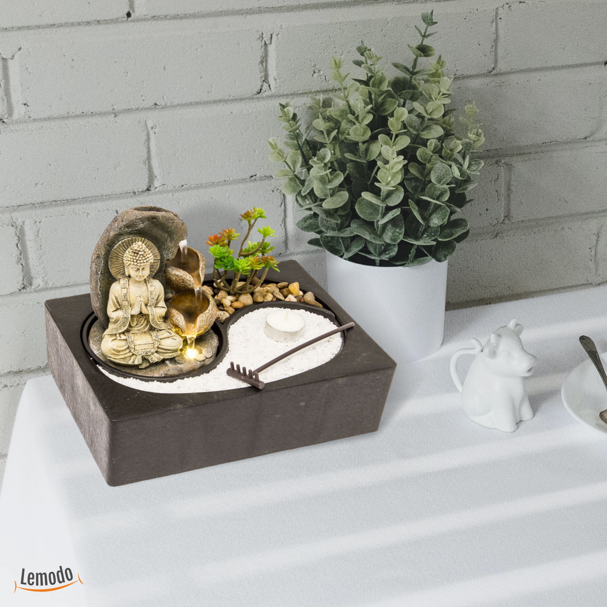 Zimmerbrunnen mit LED-Beleuchtung und Buddha, Feng Shui Dekobrunnen mit kleinem ZEN Garten